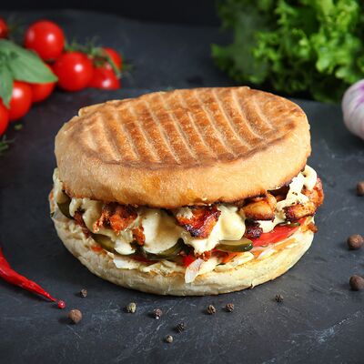 Поджаренная пшеничная булочка, курица, маринованные огурцы, помидоры, капустный салат, соус карри
