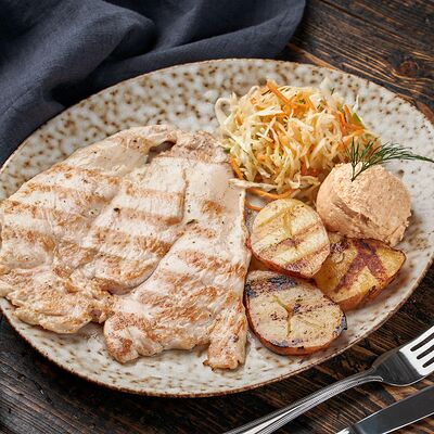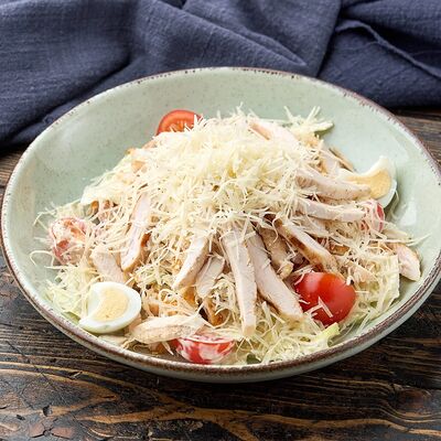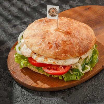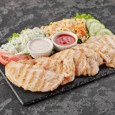 Куриное филе на гриле, огурец, яичный блин, майонез, зеленый лук