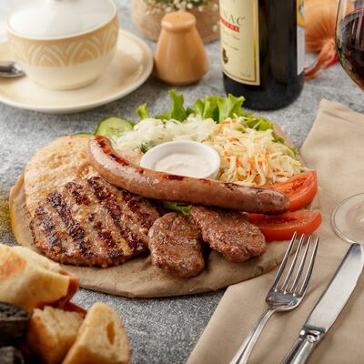 Белая булочка, котлета из говядины и свинины с картофелем, капуста маринованная, лук маринованный, соус сербский, соус тартар