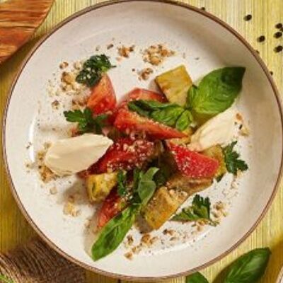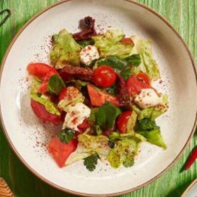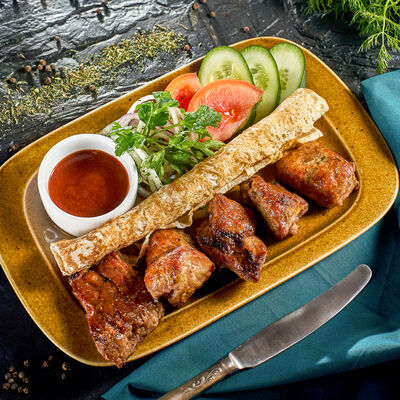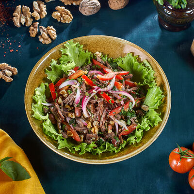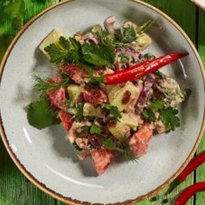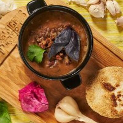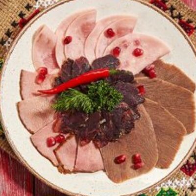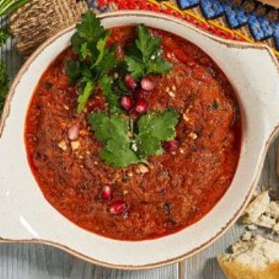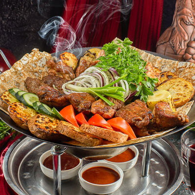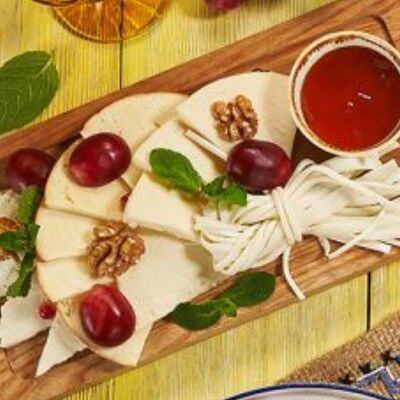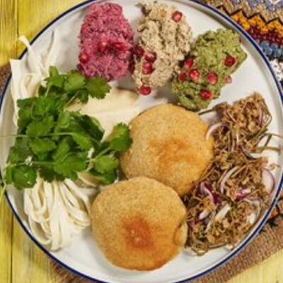 Пхали из зеленой фасоли с грецкими орехами, пхали из свеклы с грецкими орехами, пхали из шпината с грецкими орехами, джонджоли с красным луком, ароматные сыры: имеретинский, сулугуни, чечил и кукурузные лепешки. Набор для настоящего грузина