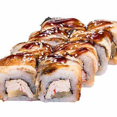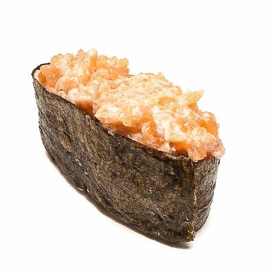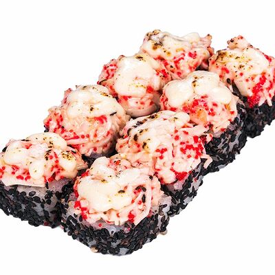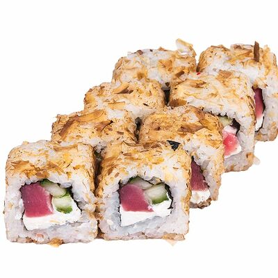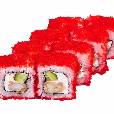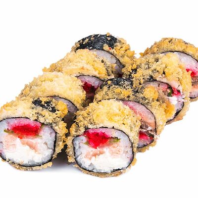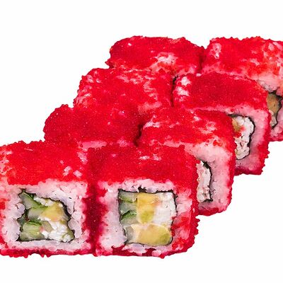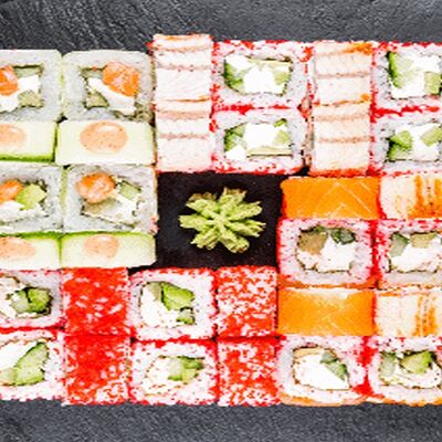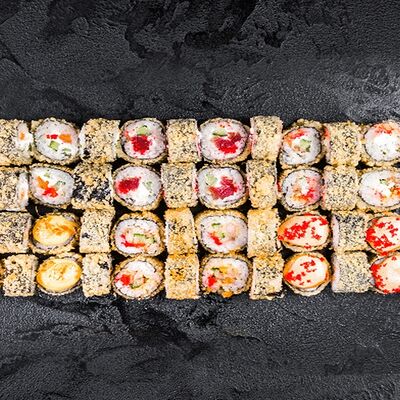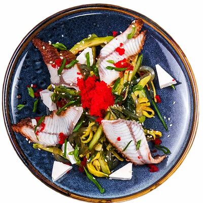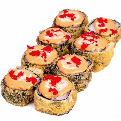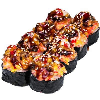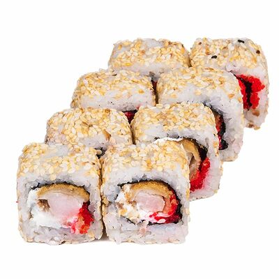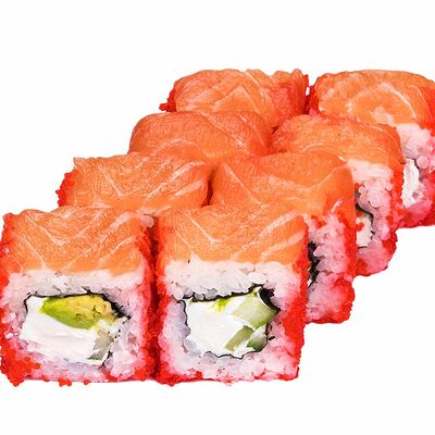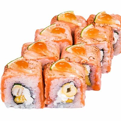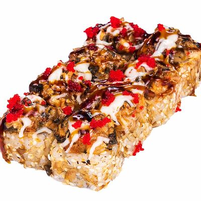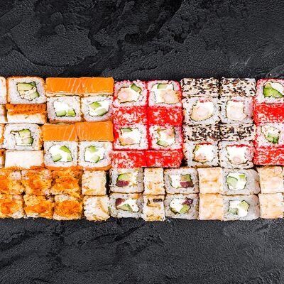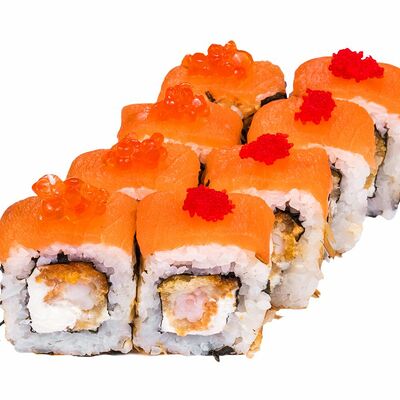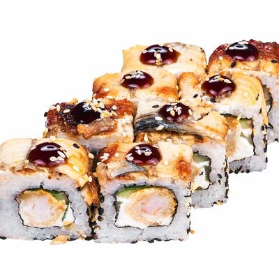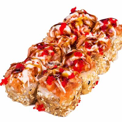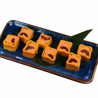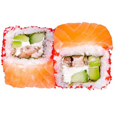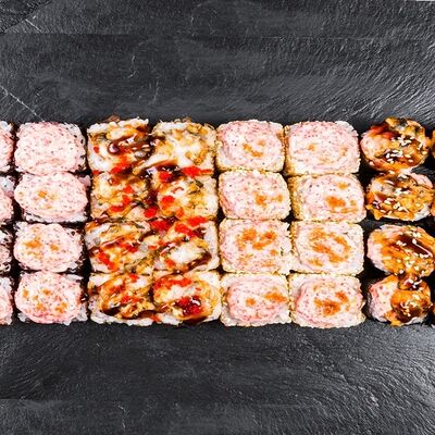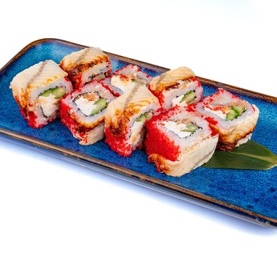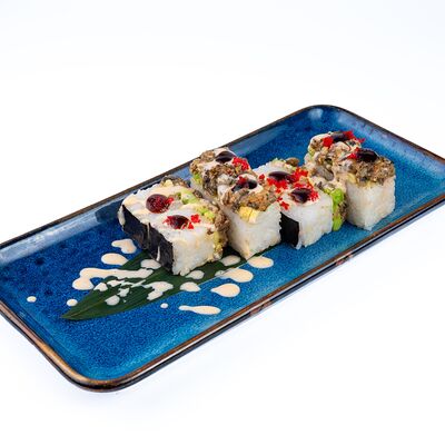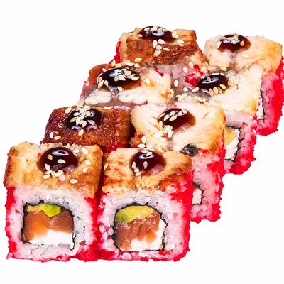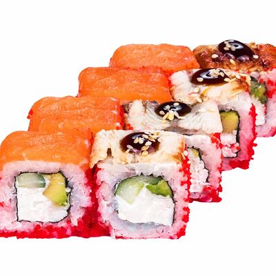 Мусс из лосося, угорь, сыр сливочный, омлет, икра тобико, спайс соус