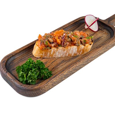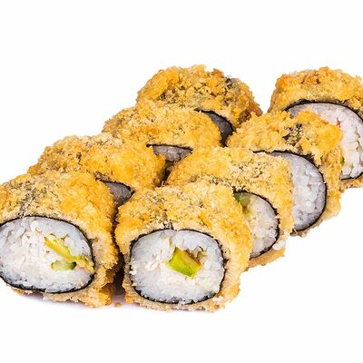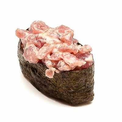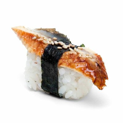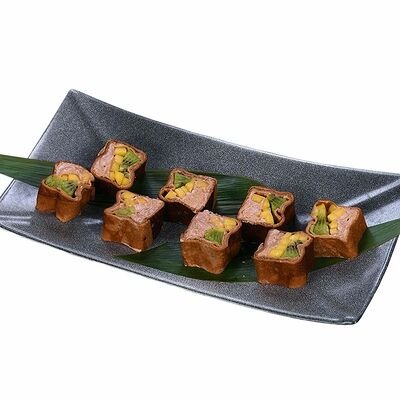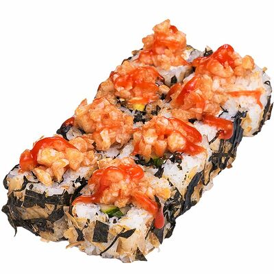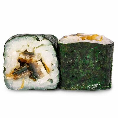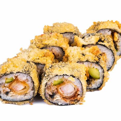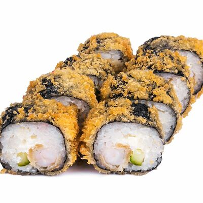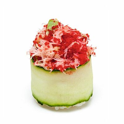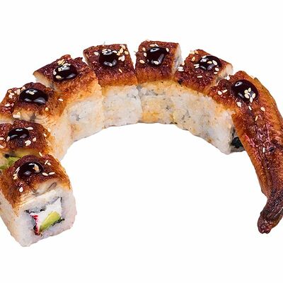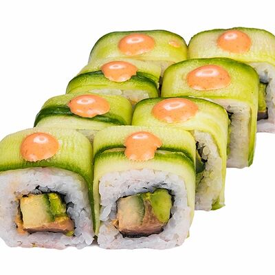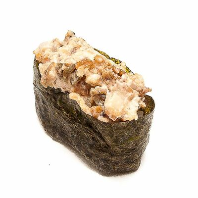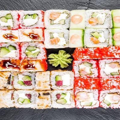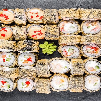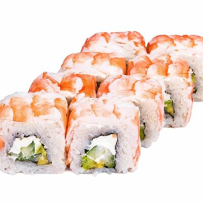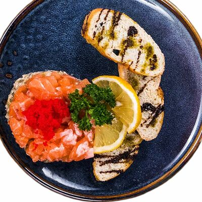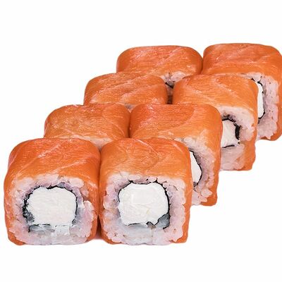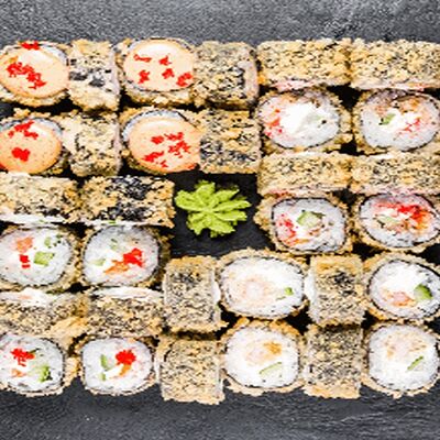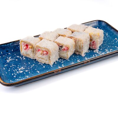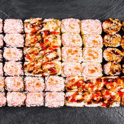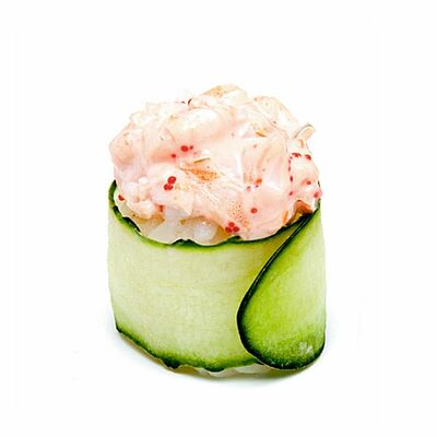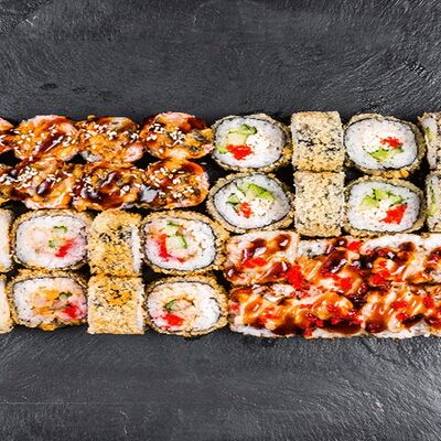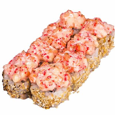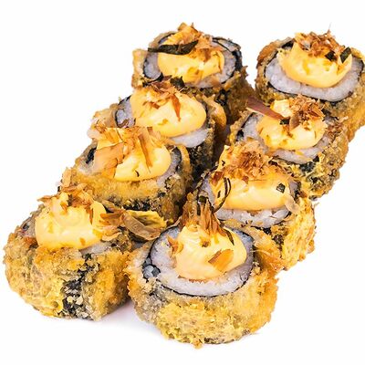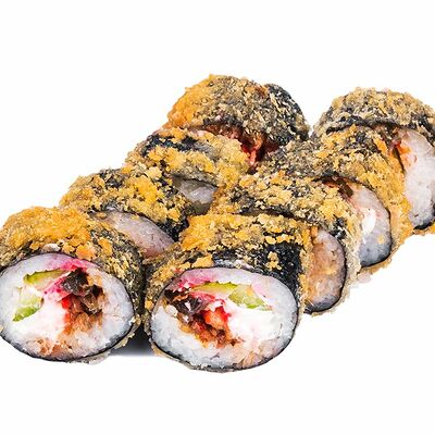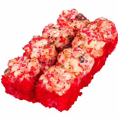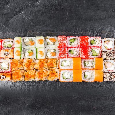 Мусс из лосося, угорь, сыр сливочный, омлет, икра тобико, спайс соус