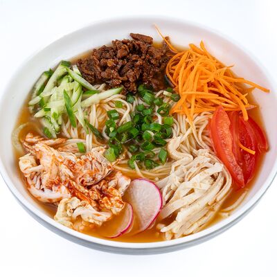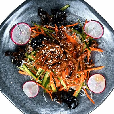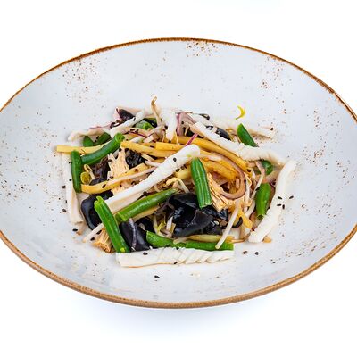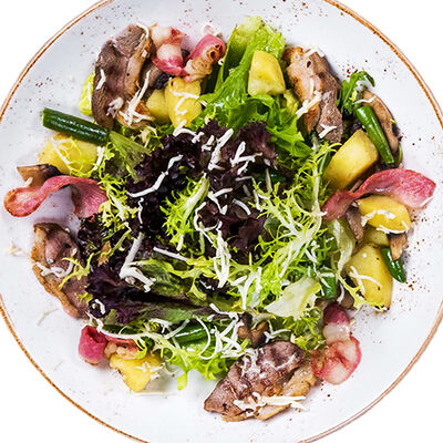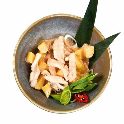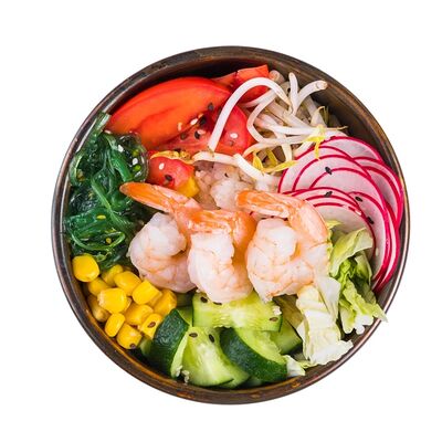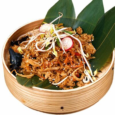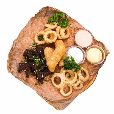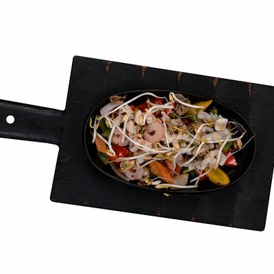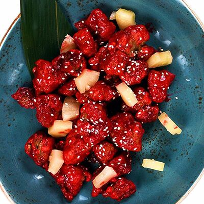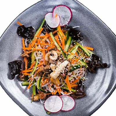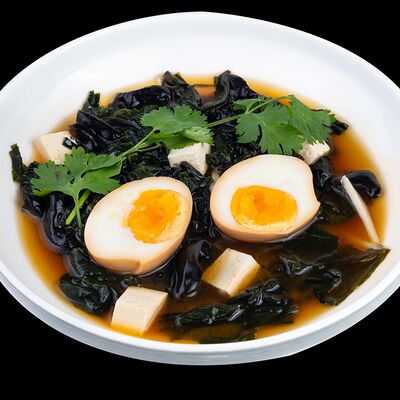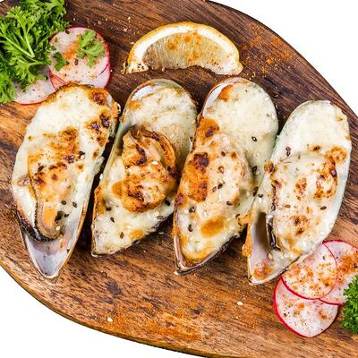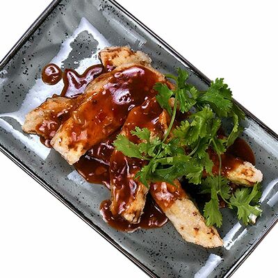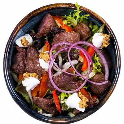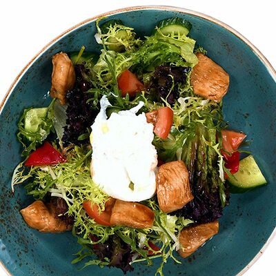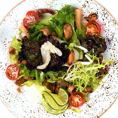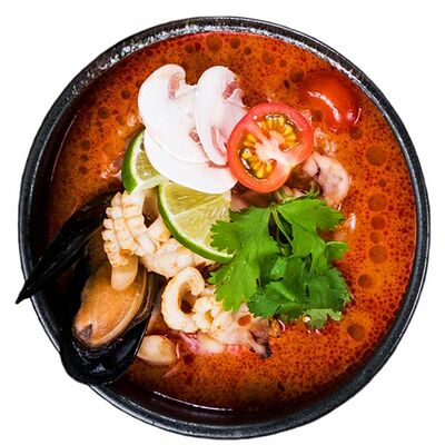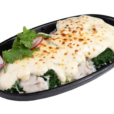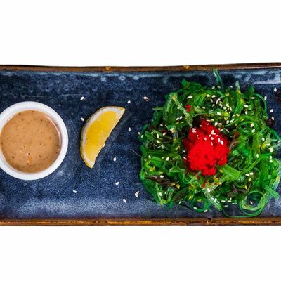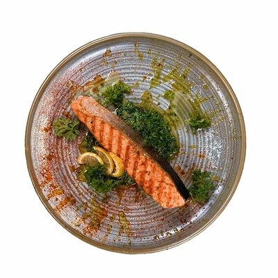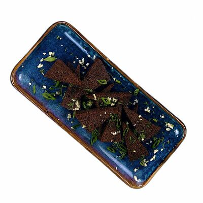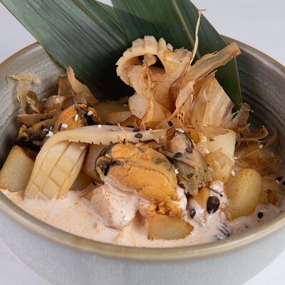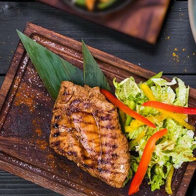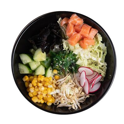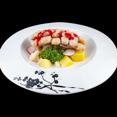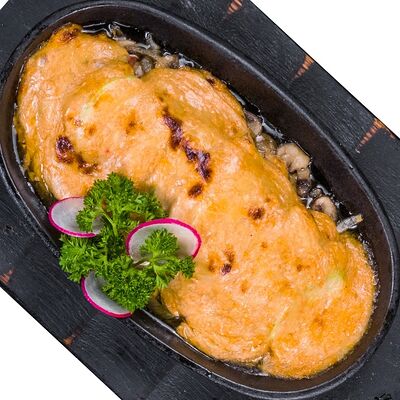 Мусс из лосося, угорь, сыр сливочный, омлет, икра тобико, спайс соус