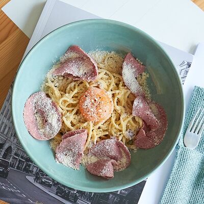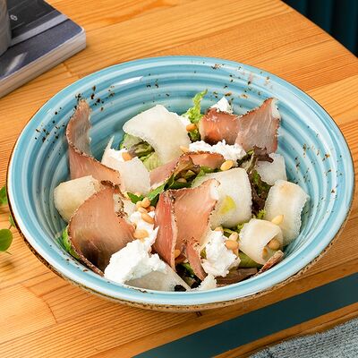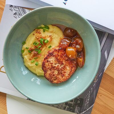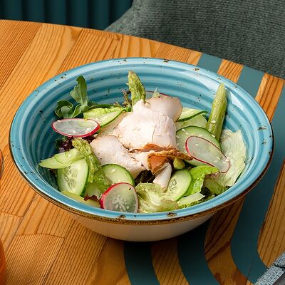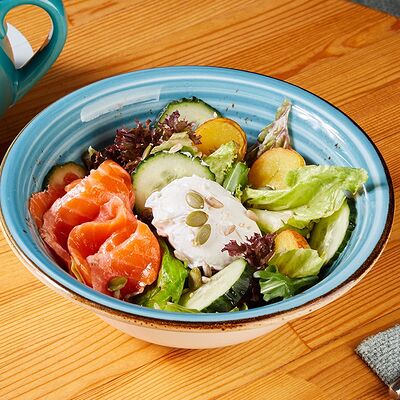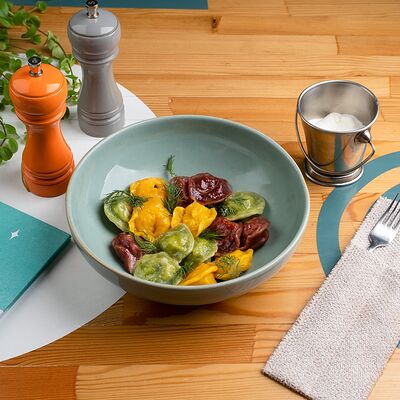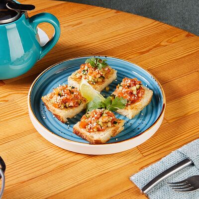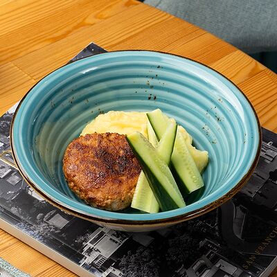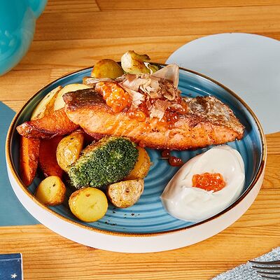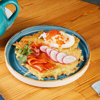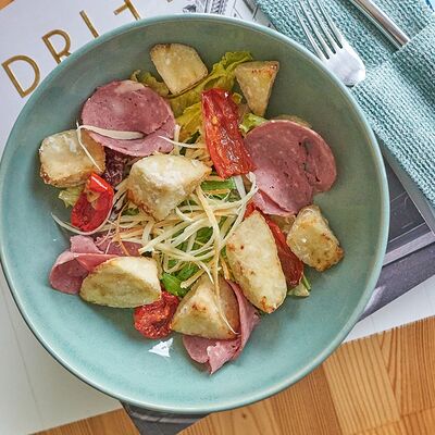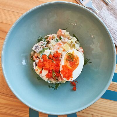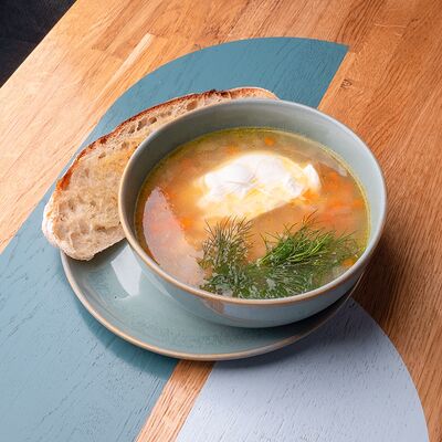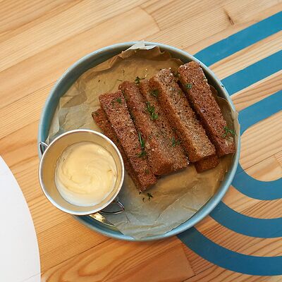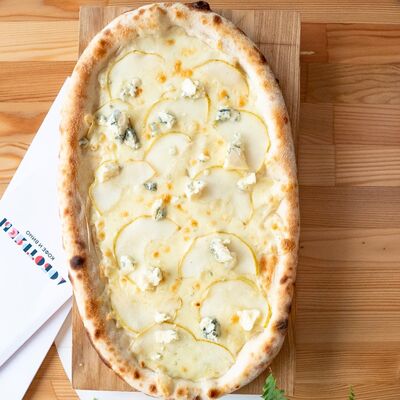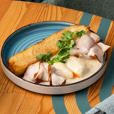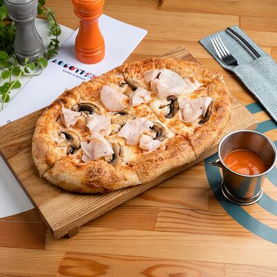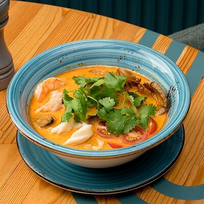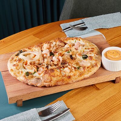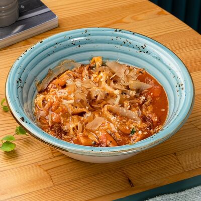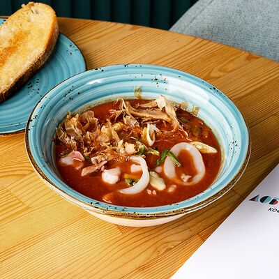 Томатная основа, креветки, мясо мидий, кальмар, стружка тунца, зеленый лук, хлеб картофельный