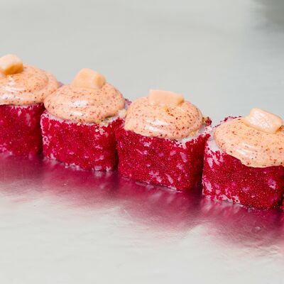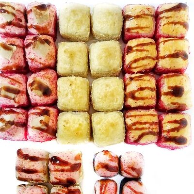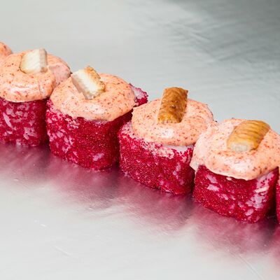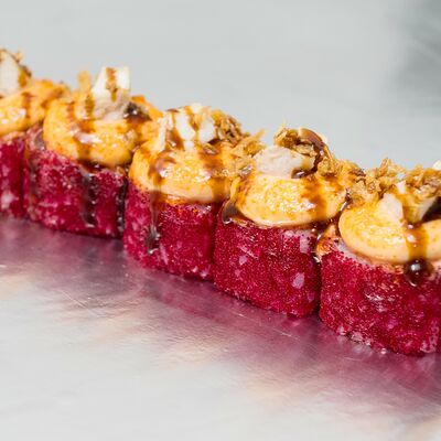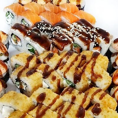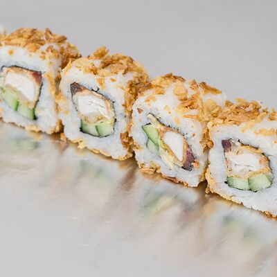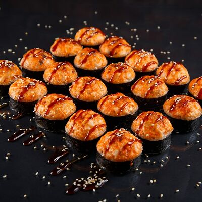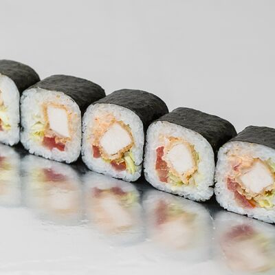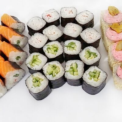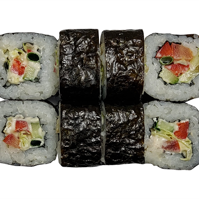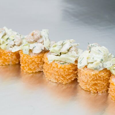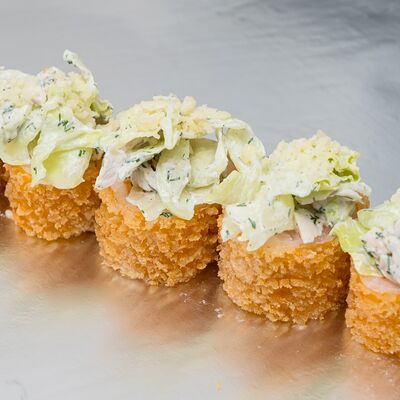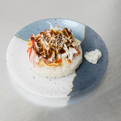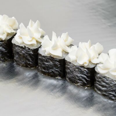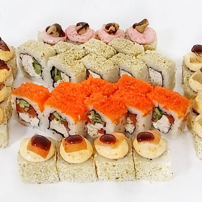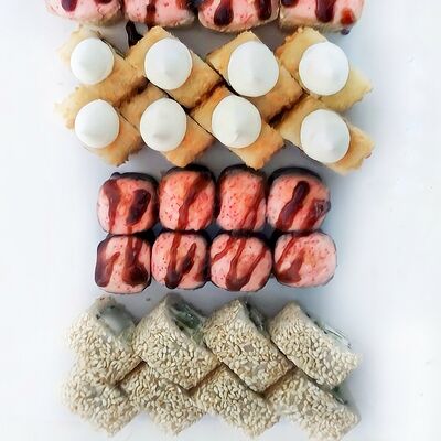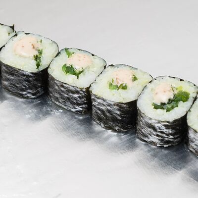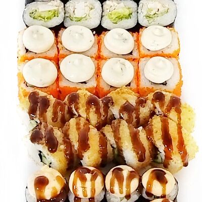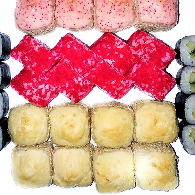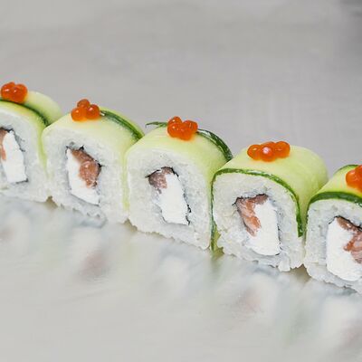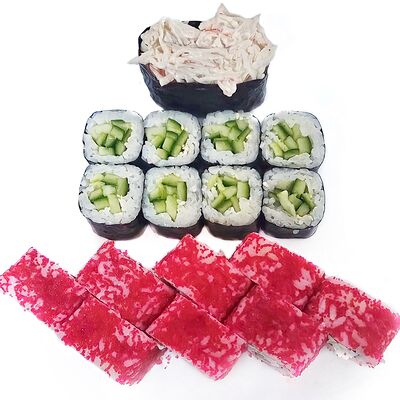 Снежный краб, майонез, огурцы, кунжут. В комплекте имбирь белый, васаби и палочки для суши идут бесплатно. Соевый соус не прилагается к бесплатному комплекту