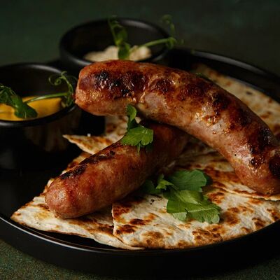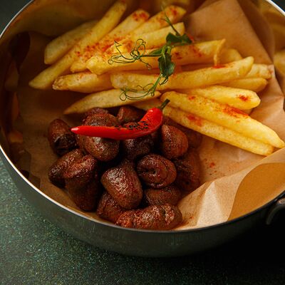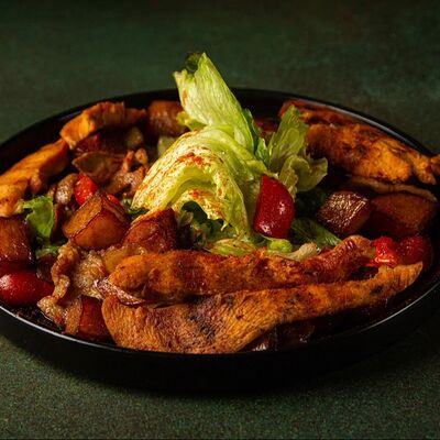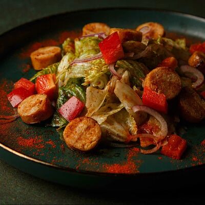 Салат с баварскими колбасками, запеченным картофелем, болгарским перцем, красным луком, листьями салата, маринованным огурчиком, заправленный пикантным соусом