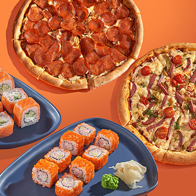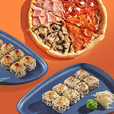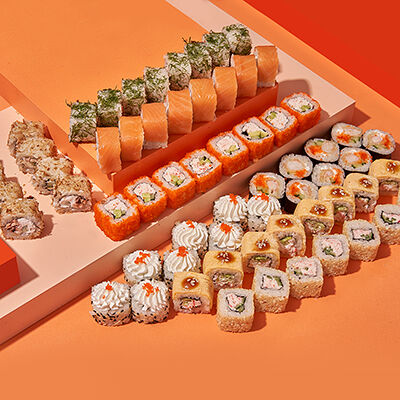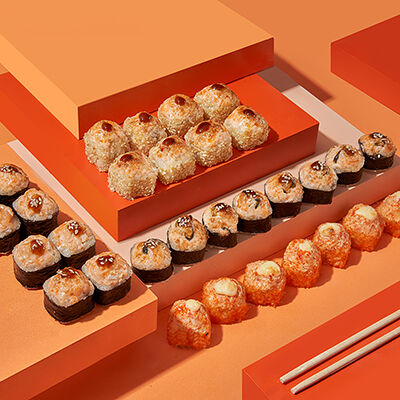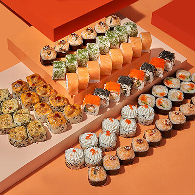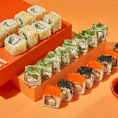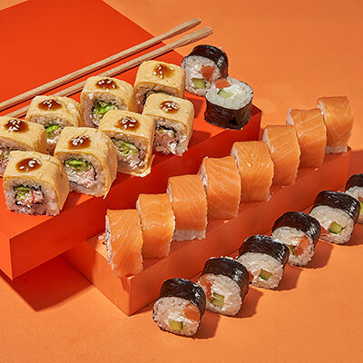 Ролл запеченный лосось, ролл Фудзи, ролл шиитаке хот, ролл Свежий