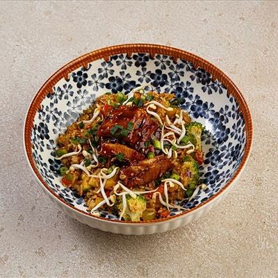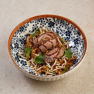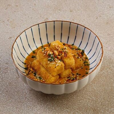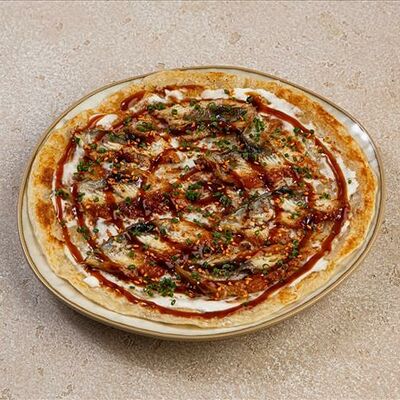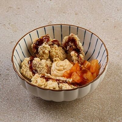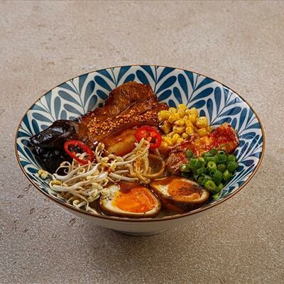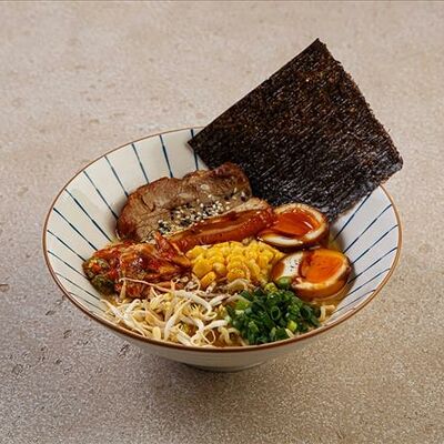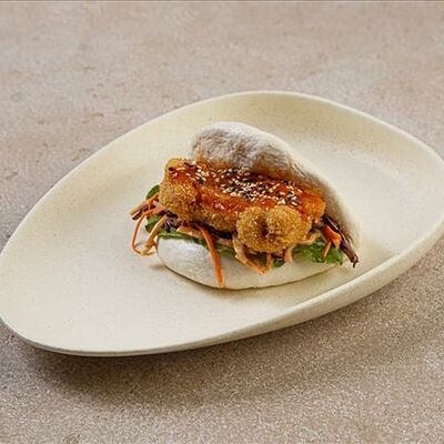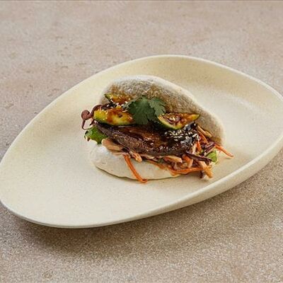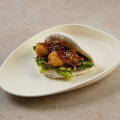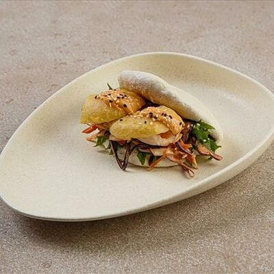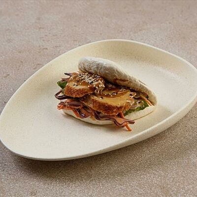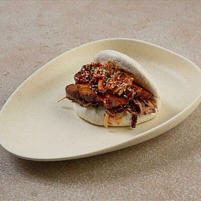 Паровая булочка, свиная грудинка, коул-слоу (капуста белокочанная, капуста краснокочанная, морковь), капуста кимчи, соус тонкацу
