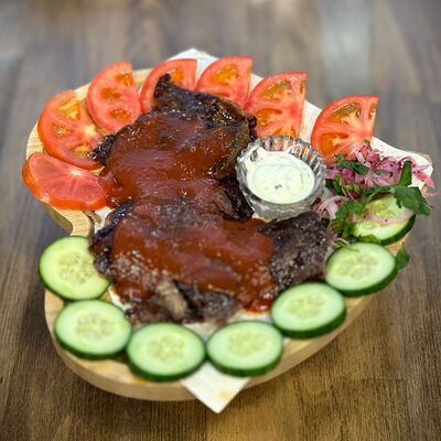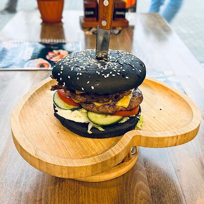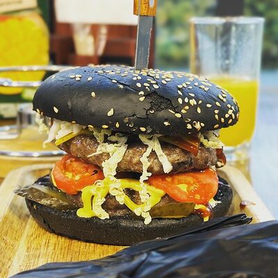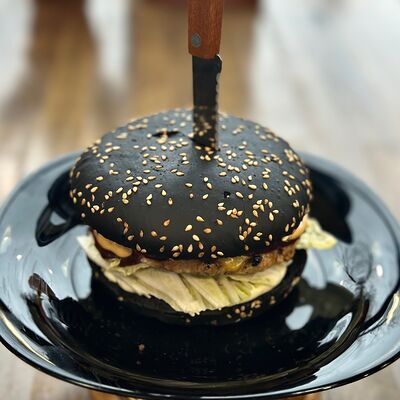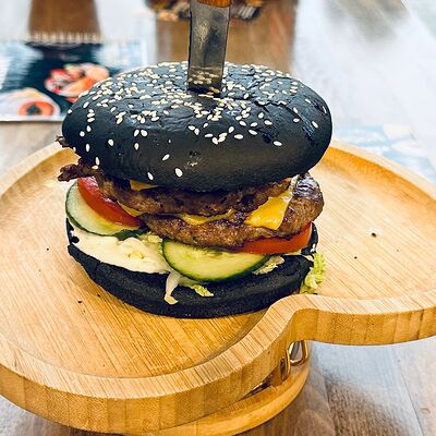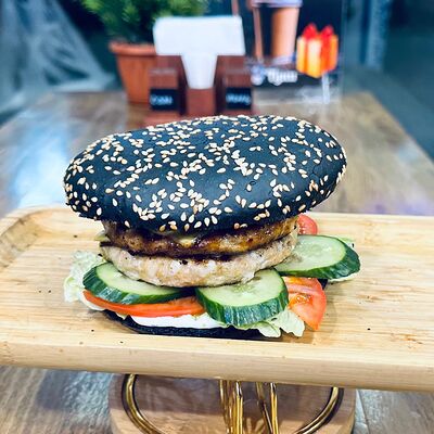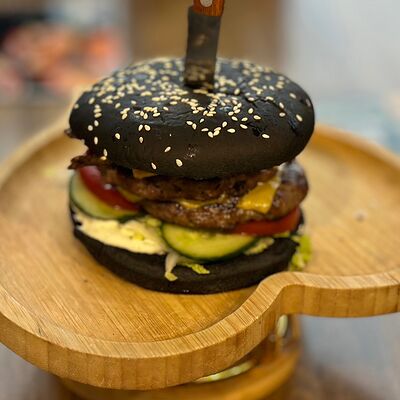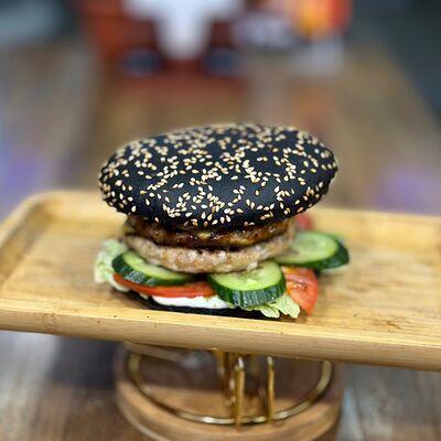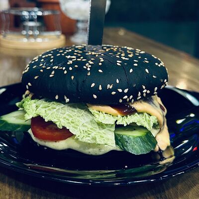Черная булочка с кунжутом, говядина, сыр, салат айсберг, свежие огурцы и помидоры, соус сырный, соус барбекю, соус чесночный