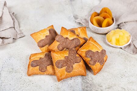 Изящные конвертики изготавливаются из тонко раскатанного нежного песочного теста на твороге с начинкой из консервированных персика и ананаса, с добавлением абрикосовой начинки.Сверху пирожное украшается бабочкой из теста на твороге с добавлением какао, выпекается и посыпается нетающей сахарной пудрой. Пищевая ценность в 100 г продукта (среднее значение на 100 г продукта): белки - 4,4 г; жиры 25,8 г; углеводы — 35,6 г Энергетическая ценность: 392 ккал / 1642 кДж