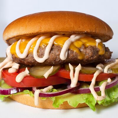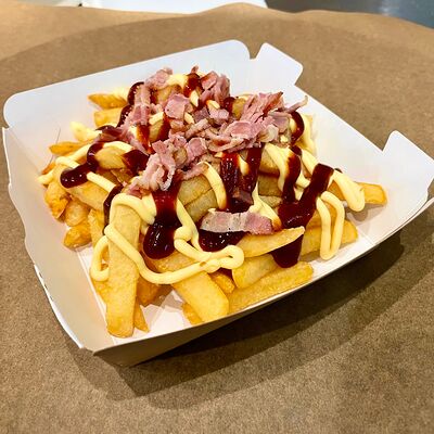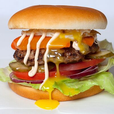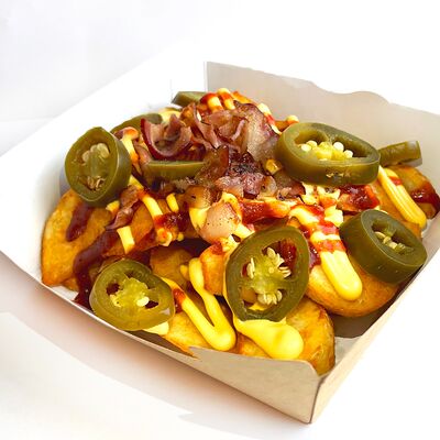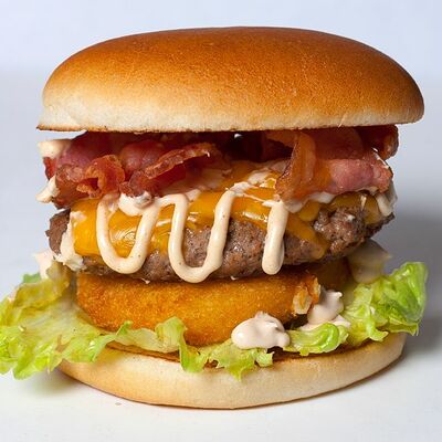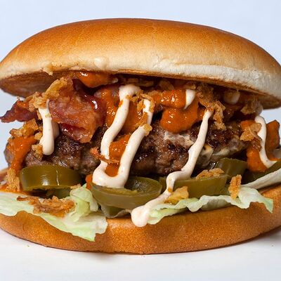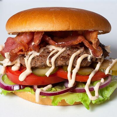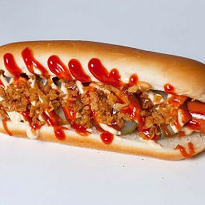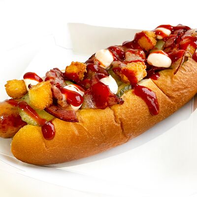 Сосиска, бекон, халапеньо, красный лук, горчица, соус Жадина, соус BBQ