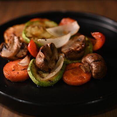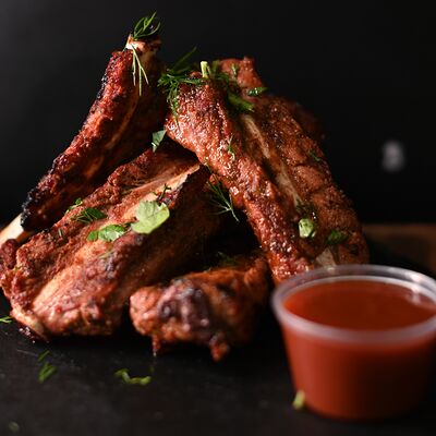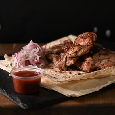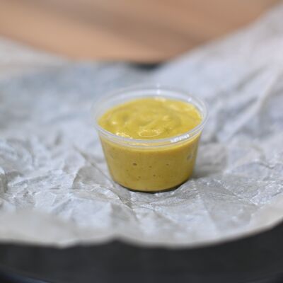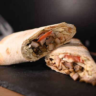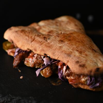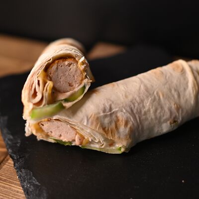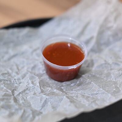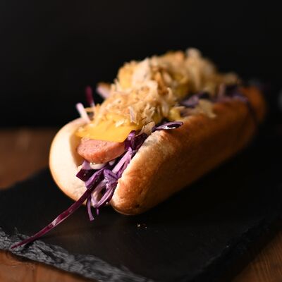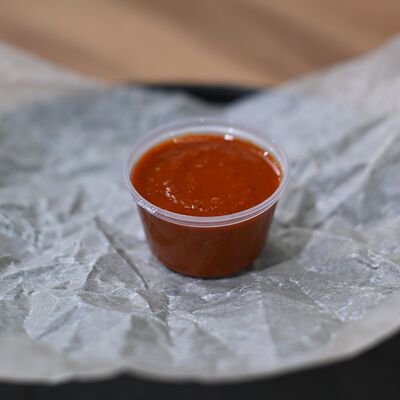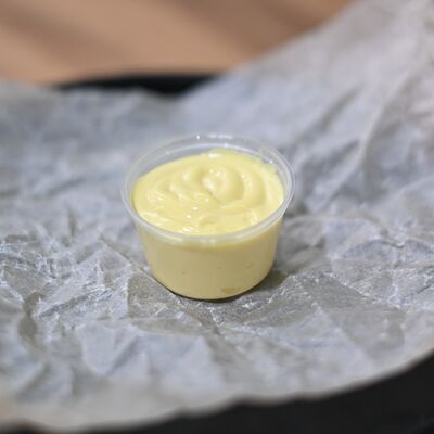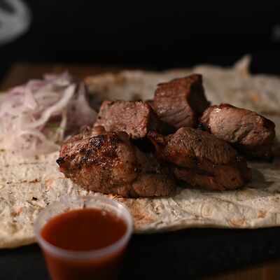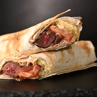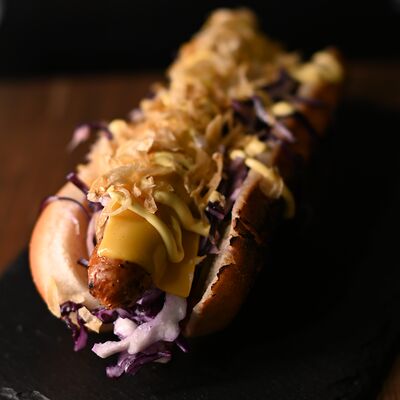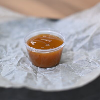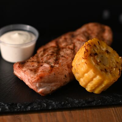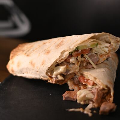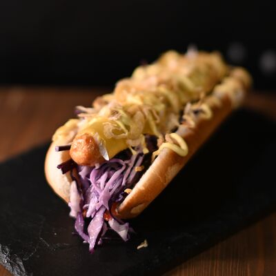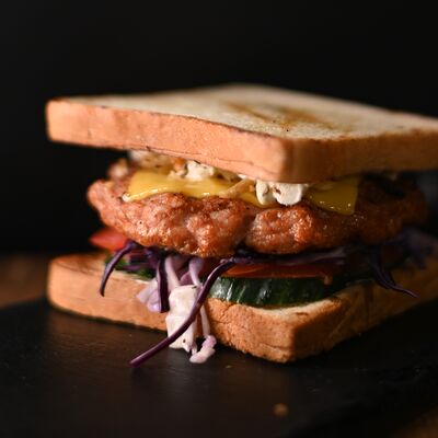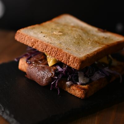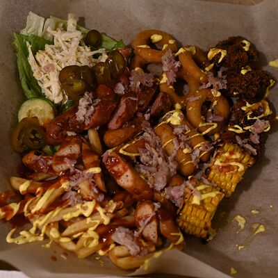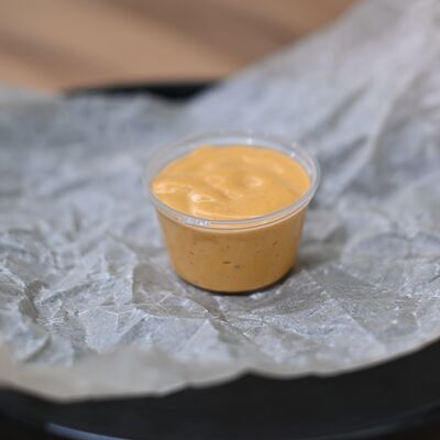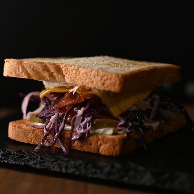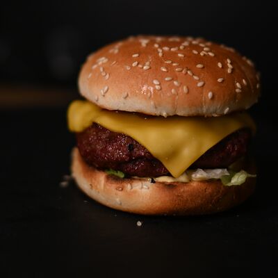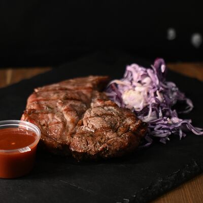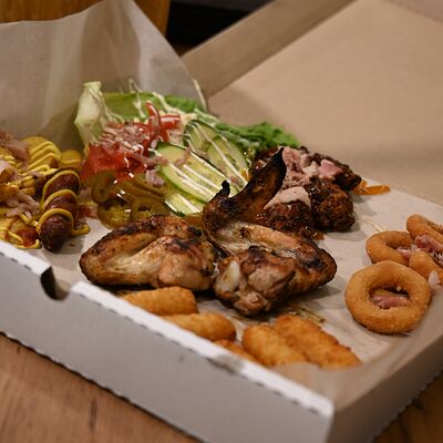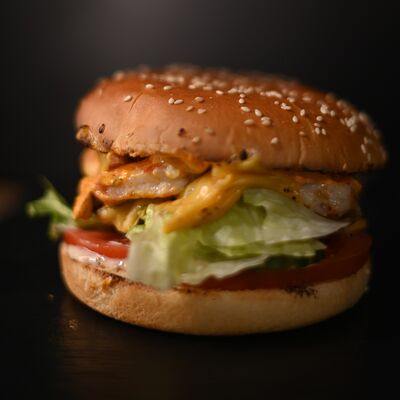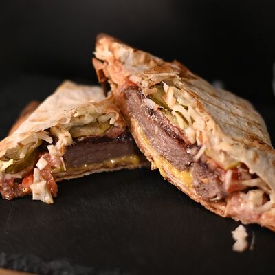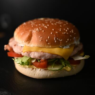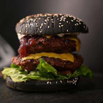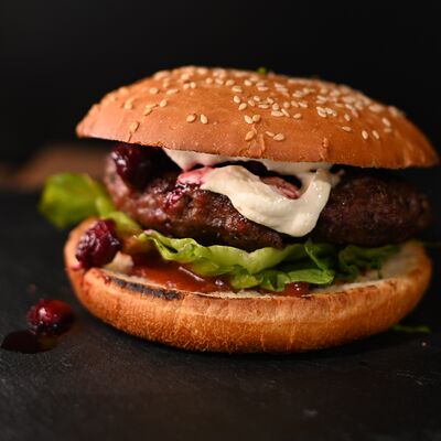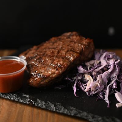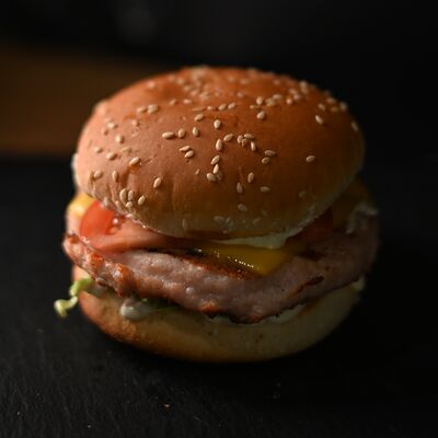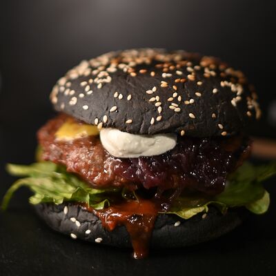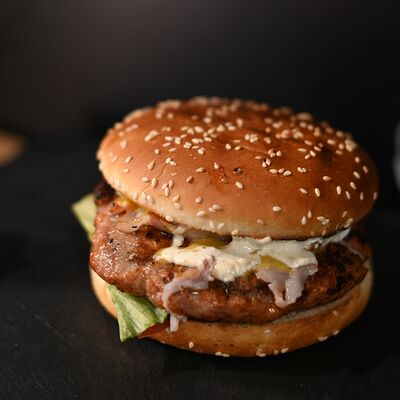 Булочка для бургера, два бифштекса из говядины, двойная порция сыра чеддер, лук мармеладный, салат айсберг, соленый огурец, томат, лук жареный, фирменный соус BBQ, соус тартар
