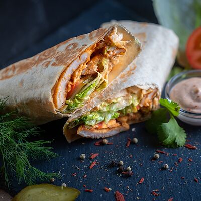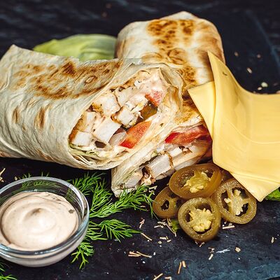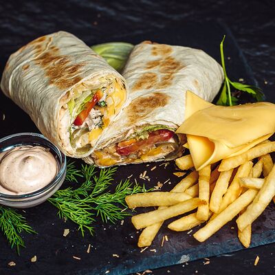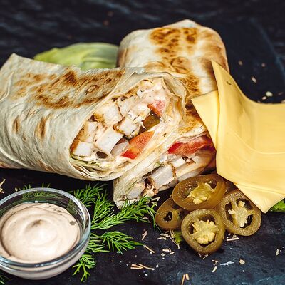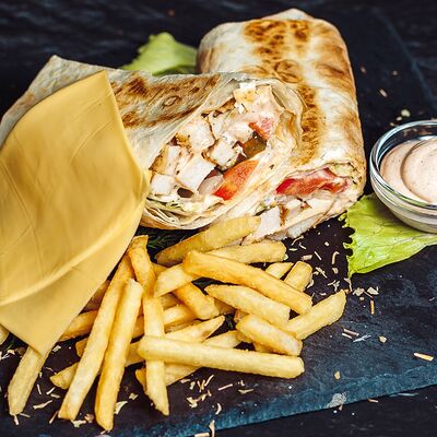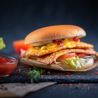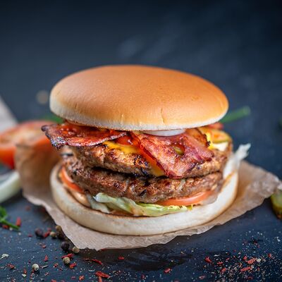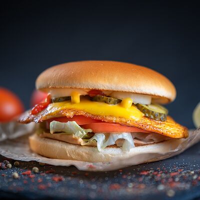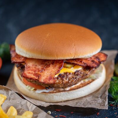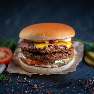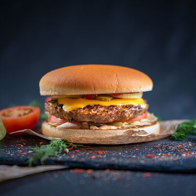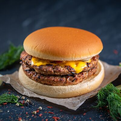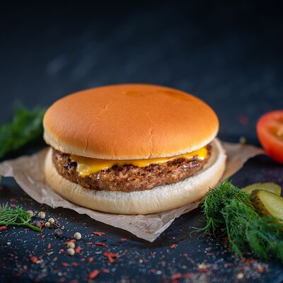 Сырный бургер на мягкой булочке, с двумя котлетами из говядины, с двумя ломтиками сыра чеддер, заправленный фирменным соусом, луком и маринованными огурчиками