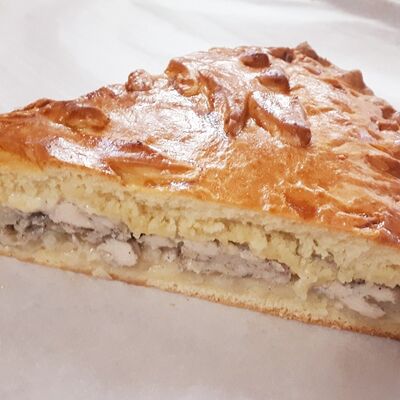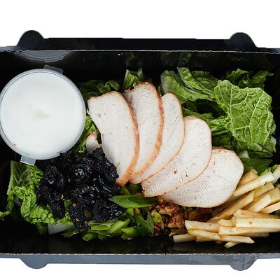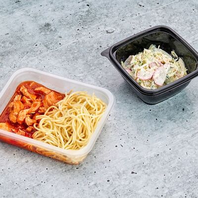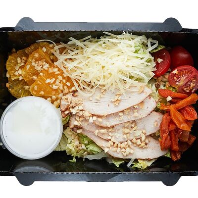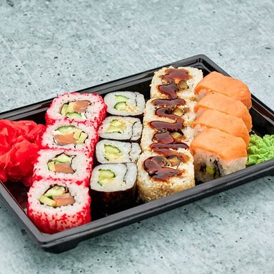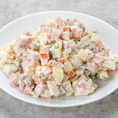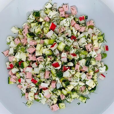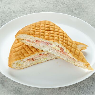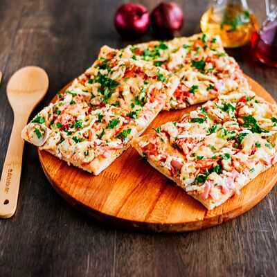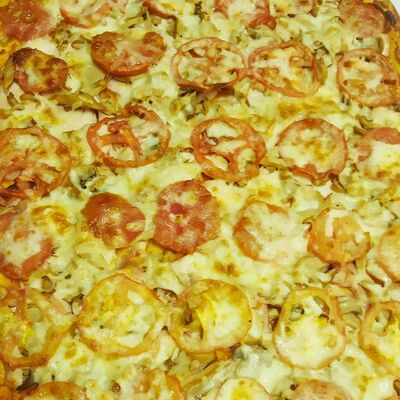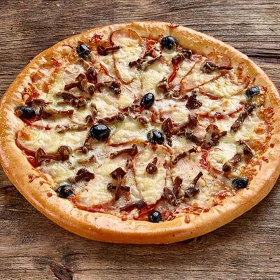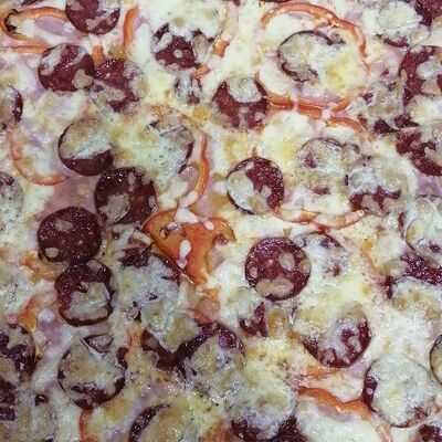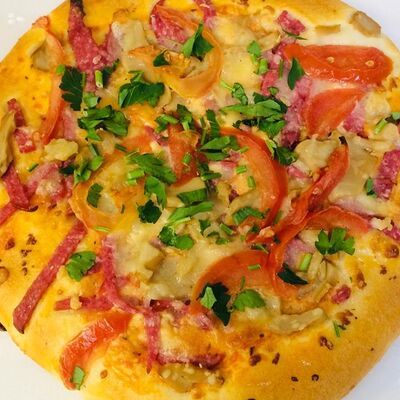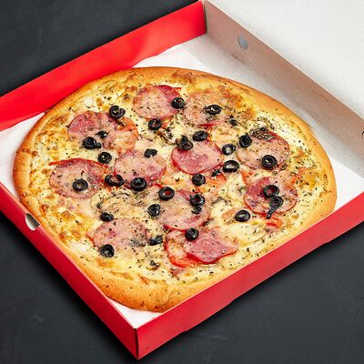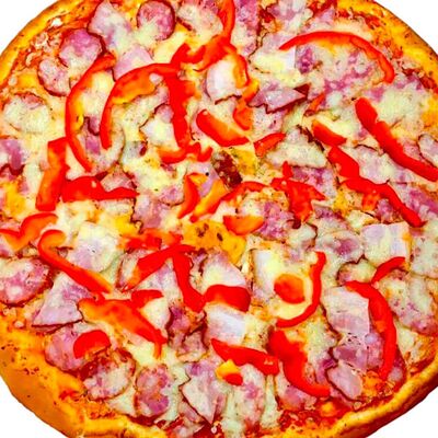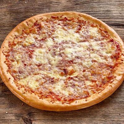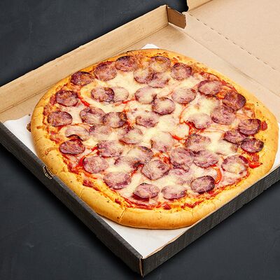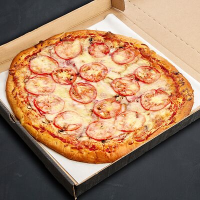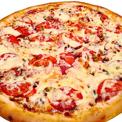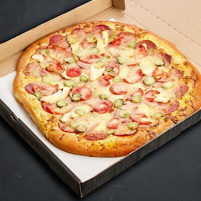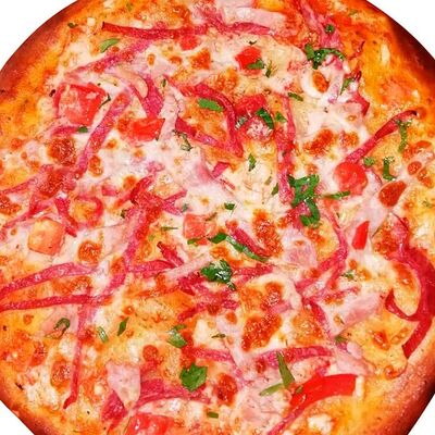 Основа (мука пшеничная высшего сорта, кефир, масло подсолнечное, вода, дрожжи прессованные, сахар, соль пищевая, орегано сушеный), соус для пиццы (томаты консервированные в собственном соку (томаты, томатный сок, регулятор кислотности: лимонная кислота), сахар, соль пищевая, чеснок, орегано сушеный, базилик сушеный, перец черный молотый), сыр моцарелла (пастеризованное коровье молоко, бактериальная культура (мезофильные и термофильные молочные кислоты), соль, хлорид кальция, бактериальный фермент (mucor miehei) ), томаты, колбаса варено-копченая (шпик, говядина, свинина, эмульсия шкурки, вода, соевый белок гидратированный, крахмал, нитритно-посолочная смесь (соль, нитрит натрия, влагоудерживающие агенты, ди-, трифосфаты (е450 (i), Е451 (i) ), регулятор кислотности (глюконо-, дельта-, лактон), усилитель вкуса (глутамат натрия), антиокислитель (лимонная кислота), натуральные специи, чеснок свежий), ветчина (филе грудок куриных, вода, свинина, мясо птицы куриное механической обвалки, белковый стабилизатор, крахмал картофельный