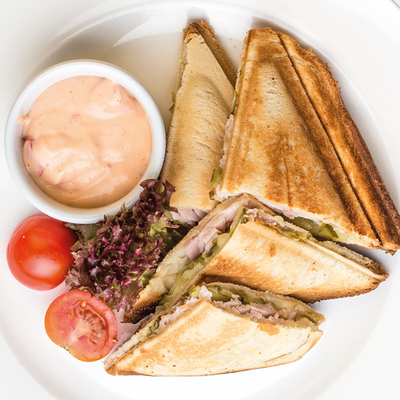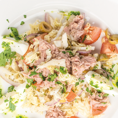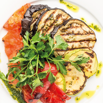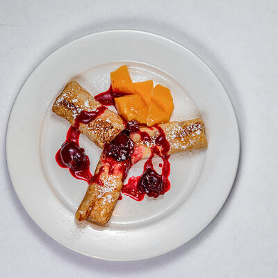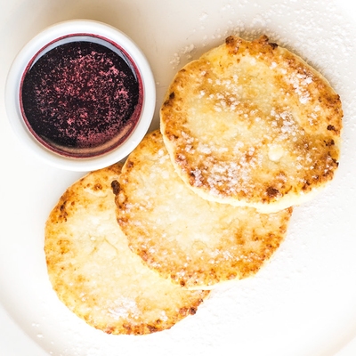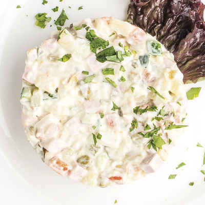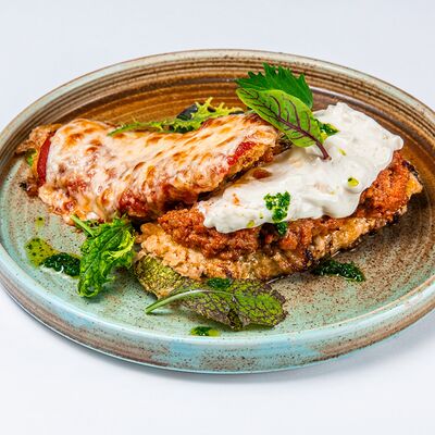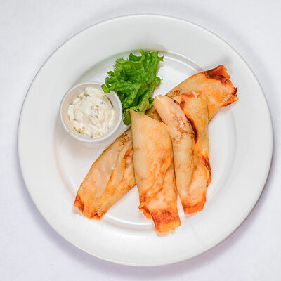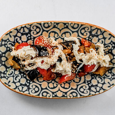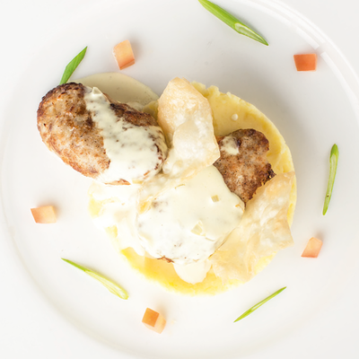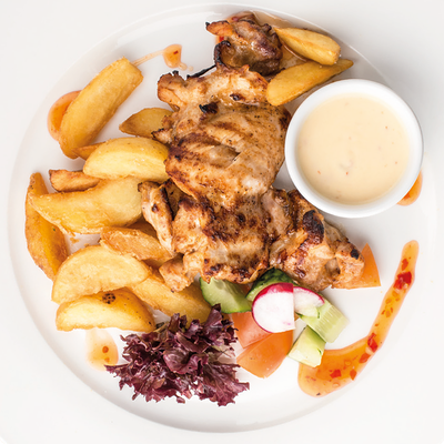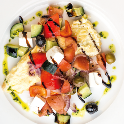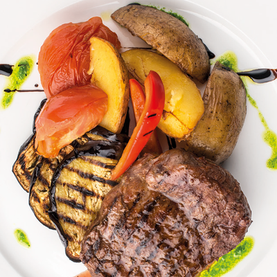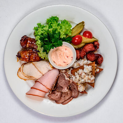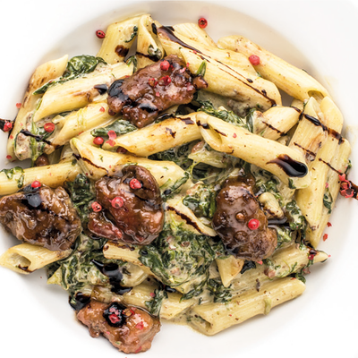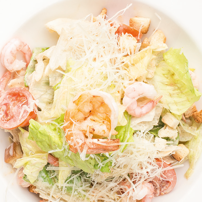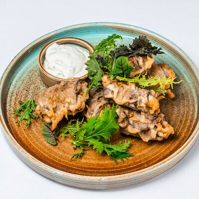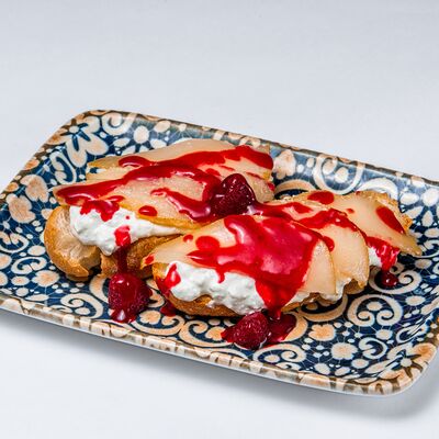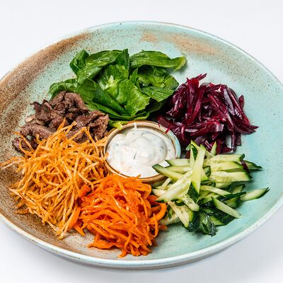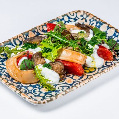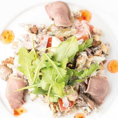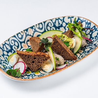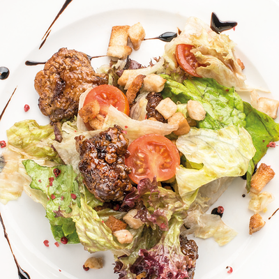 Куриная печень, черри, листья салата, гренки, мед и бальзамический соус