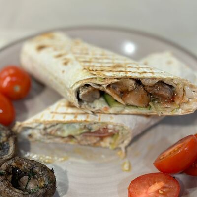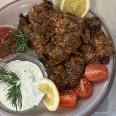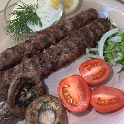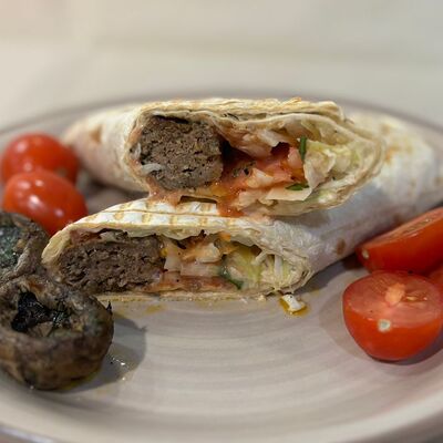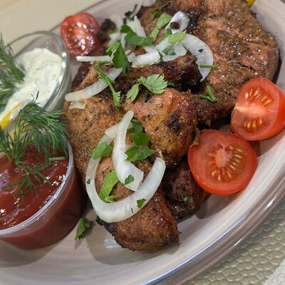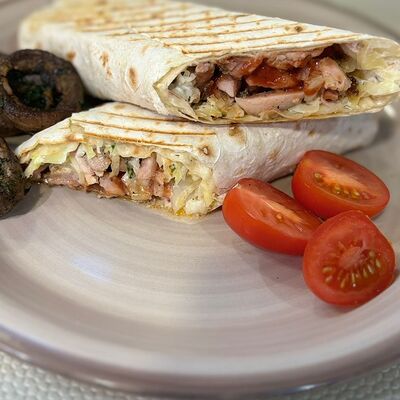 Свинина, огурцы, помидоры, маринованная капуста, фирменный белый соус, красный соус