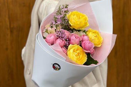Яркий и сочный букет, словно Бон Пари со взрывной карамелью. Желтая пионовидная роза Каталина в сочетании с кустовой пионовидной розой Сильвия Пинк образуют невероятно красивый, насыщенный и в то же время нежный букет