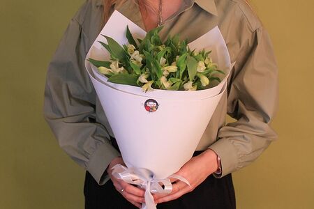 Букет из белых альстромерий - это изысканное и нежное сочетание красоты и простоты. Белый цвет символизирует чистоту, невинность и нежность, а альстромерии - это цветы, которые выражают уважение, доброту и благодарность. Такой букет идеально подходит для подарка на свадьбу, юбилей или другое торжественное событие. Он также может быть использован в качестве выражения симпатии и поддержки в трудные моменты. Белые альстромерии - это прекрасный выбор для тех, кто ценит элегантность и изысканность в цветочных композициях.
