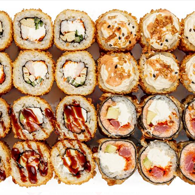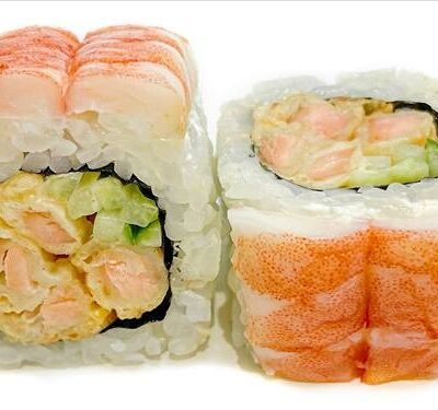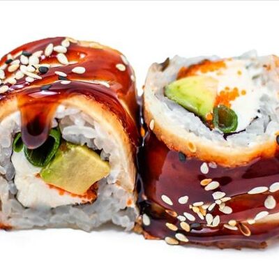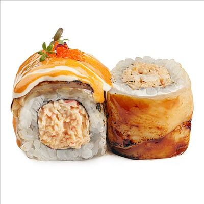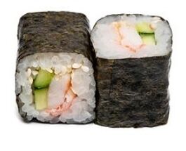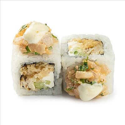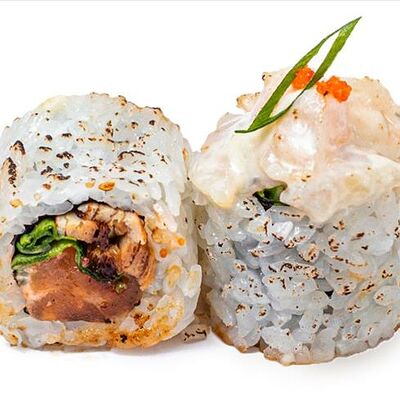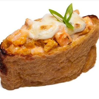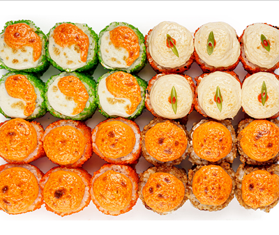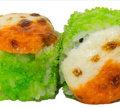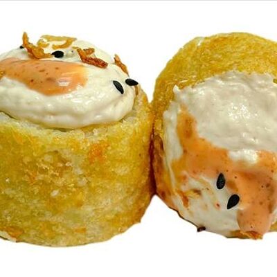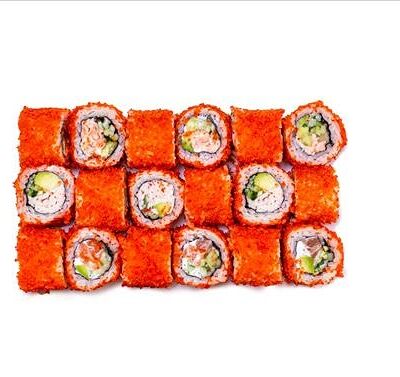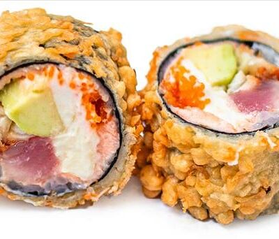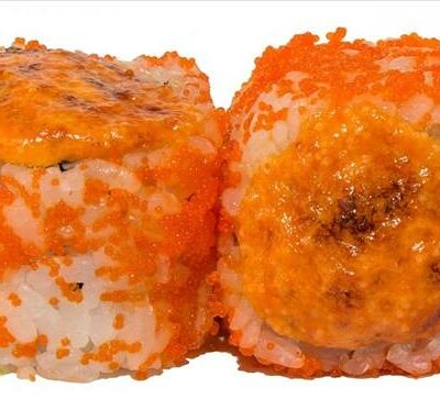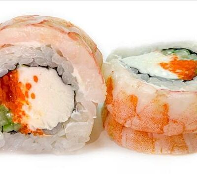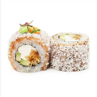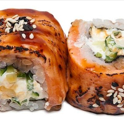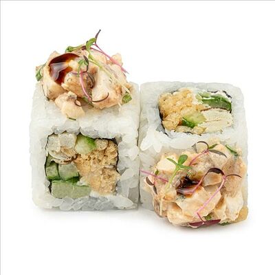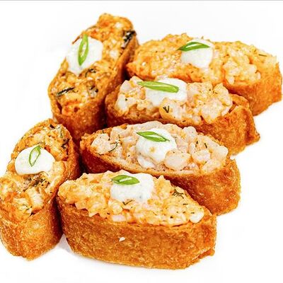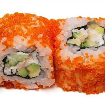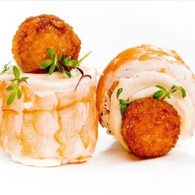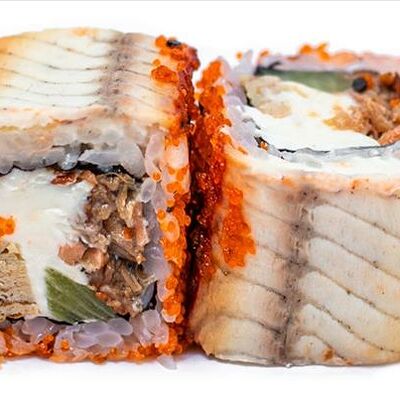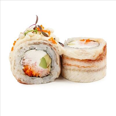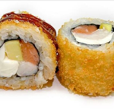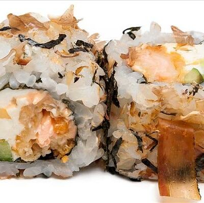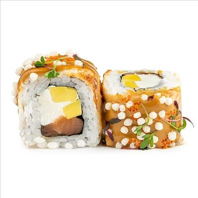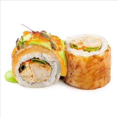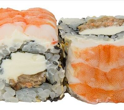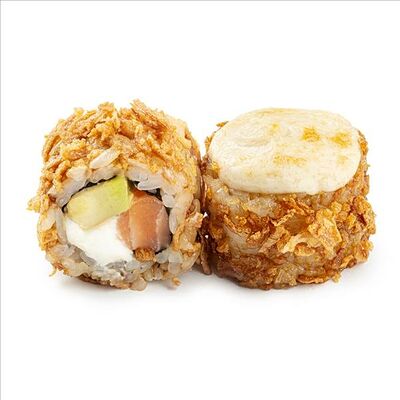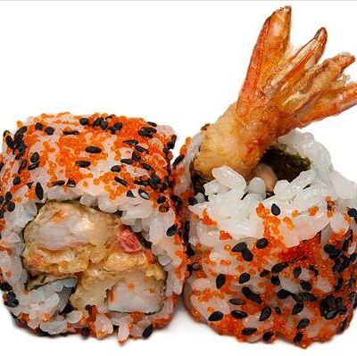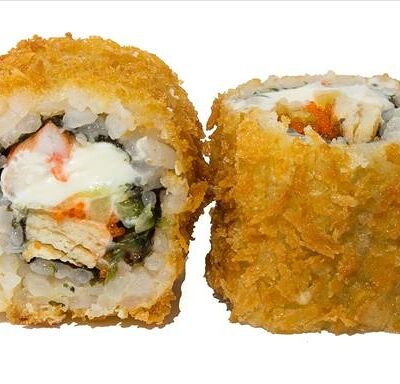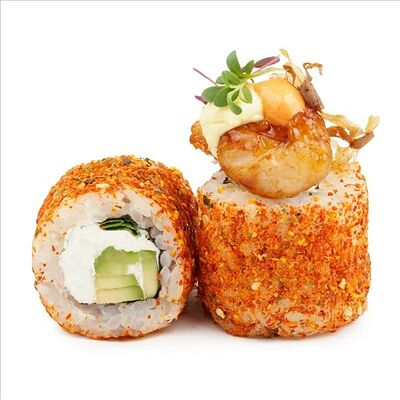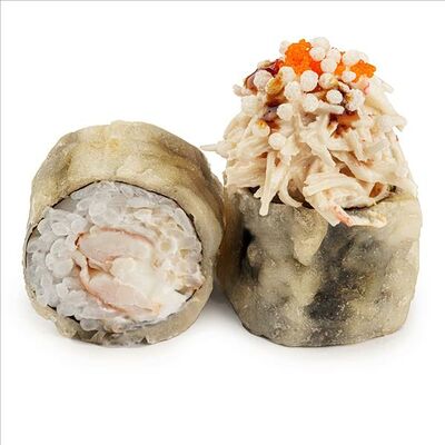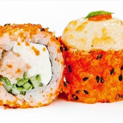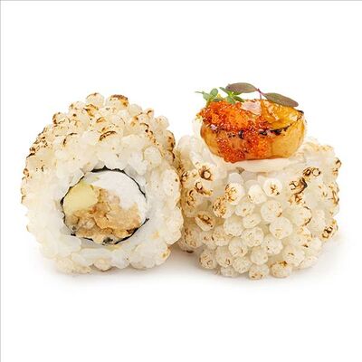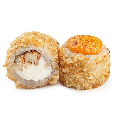 Ролл с креветкой, рисом, сливочным сыром, омлетом томаго, икрой масаго и свежим огурцом в сухарях панко (6 шт.)