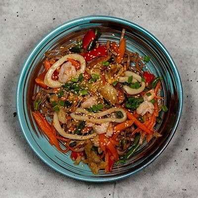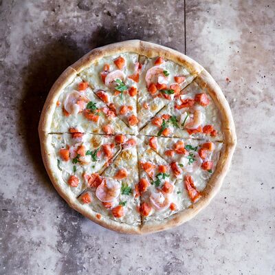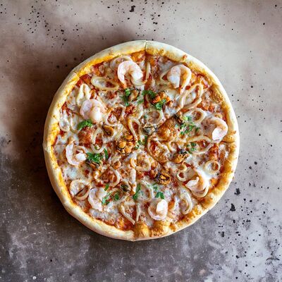 Красная основа, мидии, кальмар, креветки, моцарелла (25 см). В опциях можно выбрать диаметр