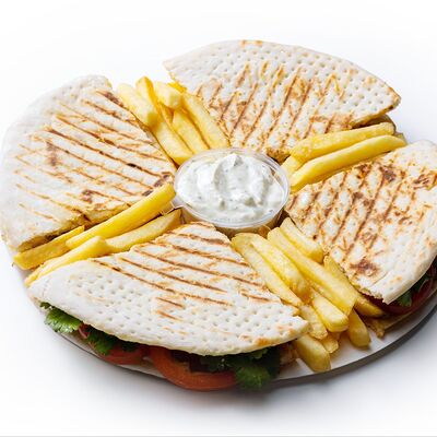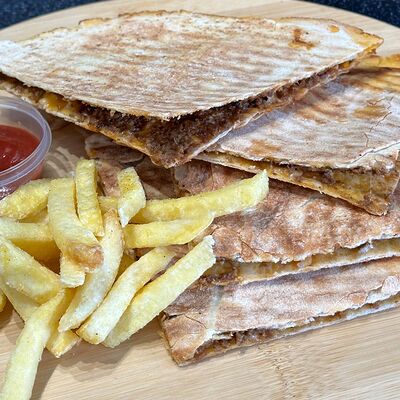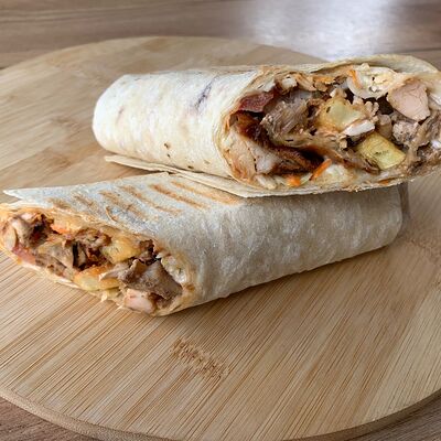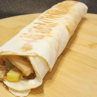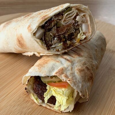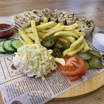 Лаваш, Фарш из говядины, Сыр, Солёный огурцы, Помидоры, Кетчуп, Фирменный соус