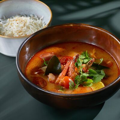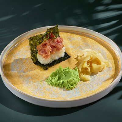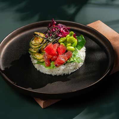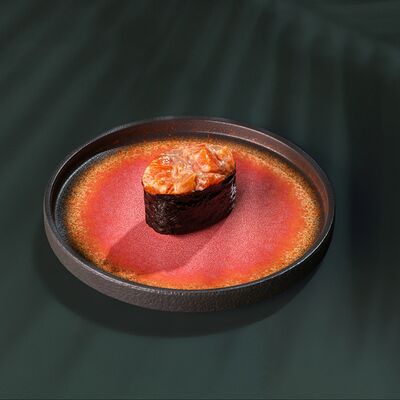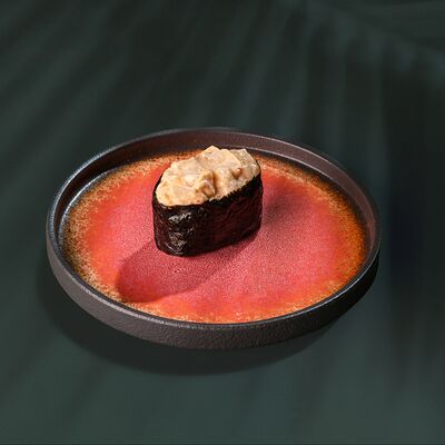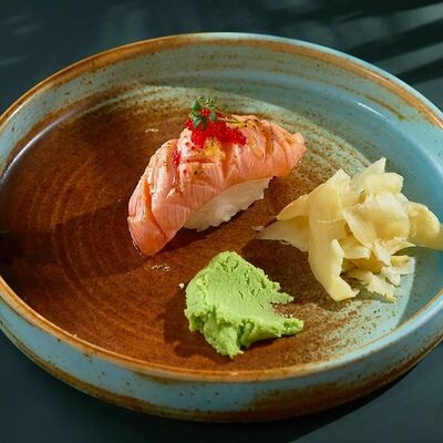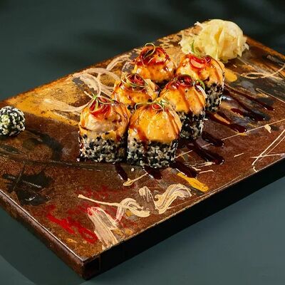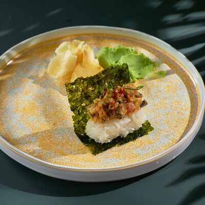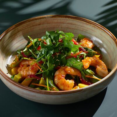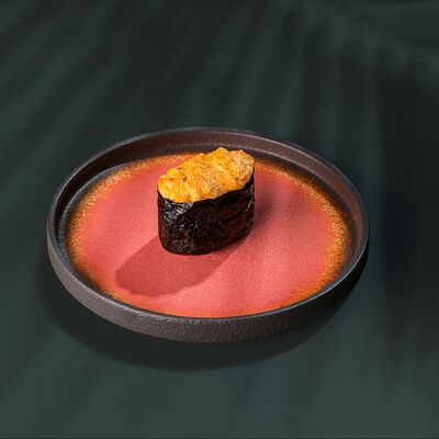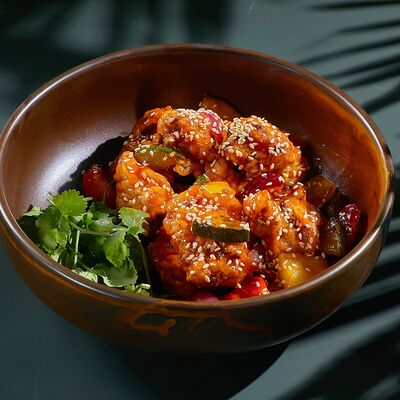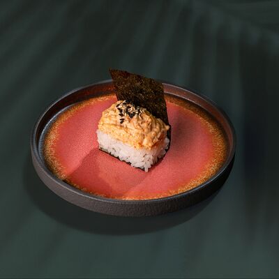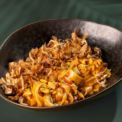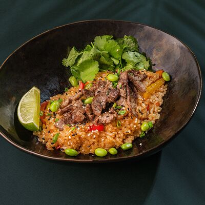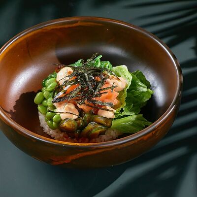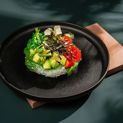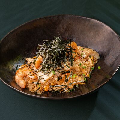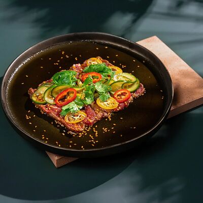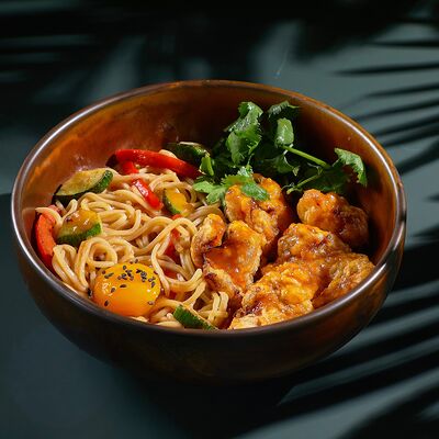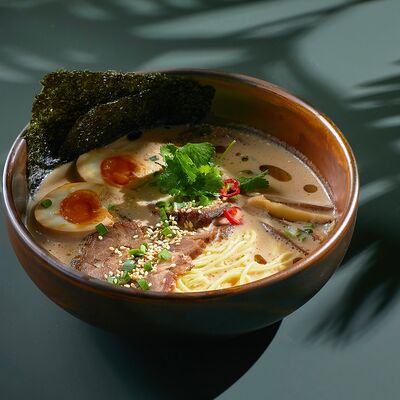 Свинина Чашу, яичная лапша, маринованное яйцо, кунжутный бульон рамен, водоросли вакаме, кинза, зелёный лук, кунжут, чили