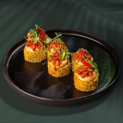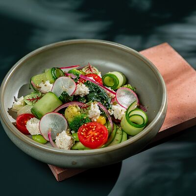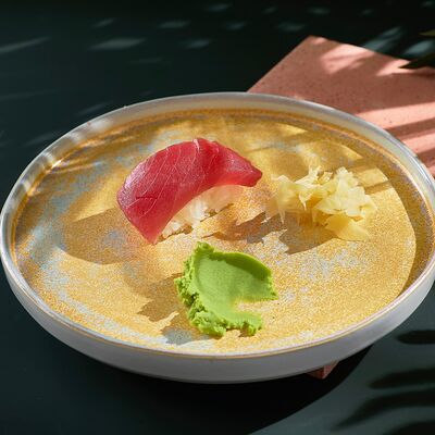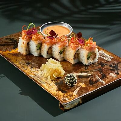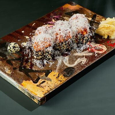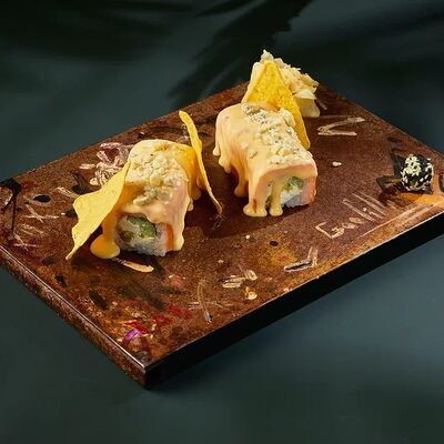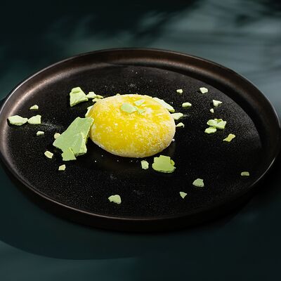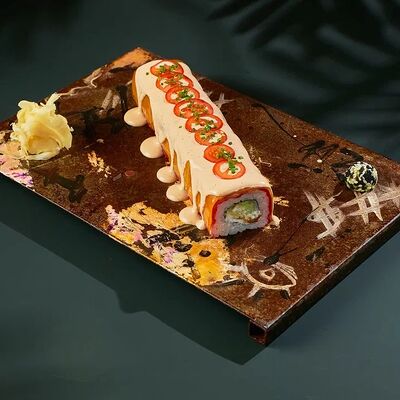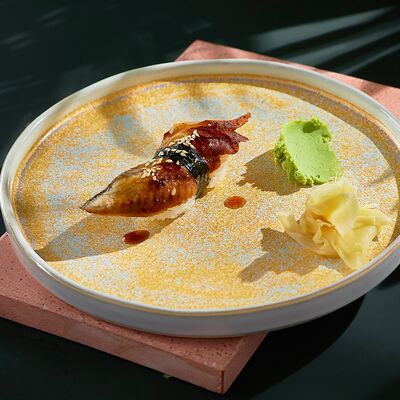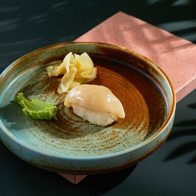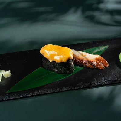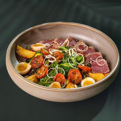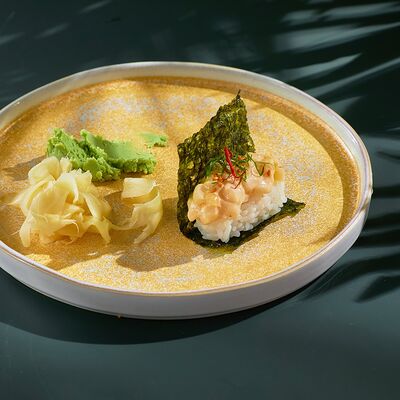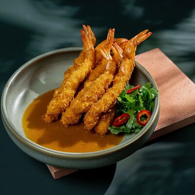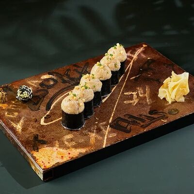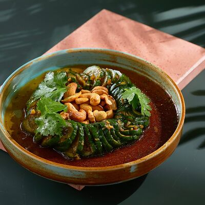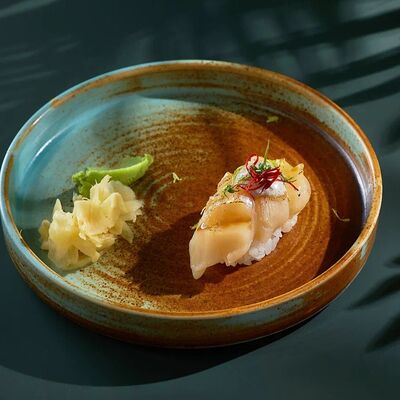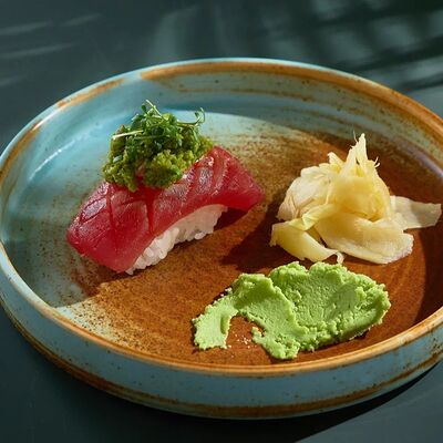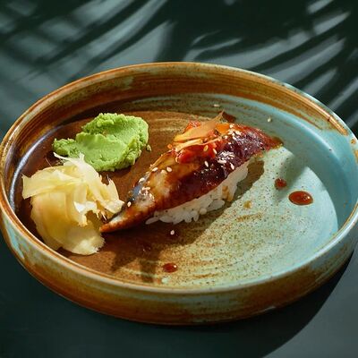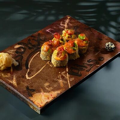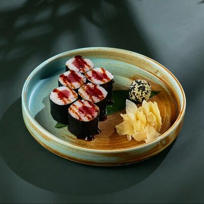 Свинина Чашу, яичная лапша, маринованное яйцо, кунжутный бульон рамен, водоросли вакаме, кинза, зелёный лук, кунжут, чили