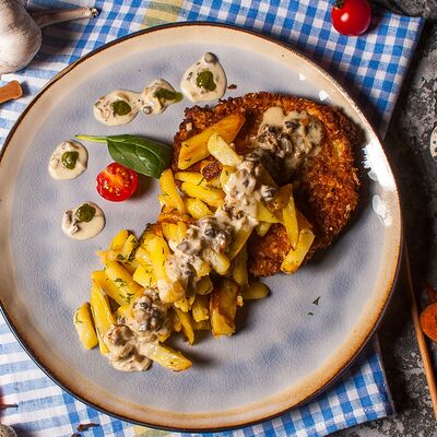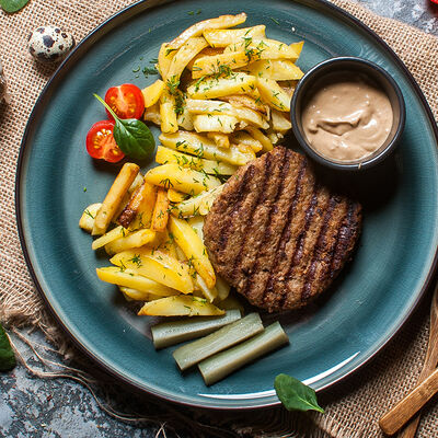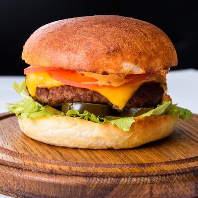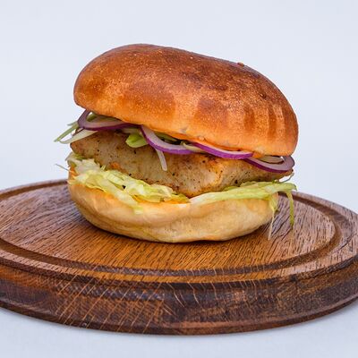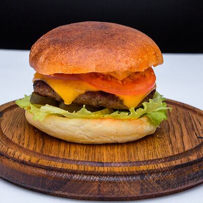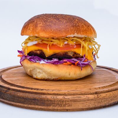 Куриная котлета, сыр чеддер, салат коул слоу, соус чесночный ранч, помидор, картофель пай, авторская булочка