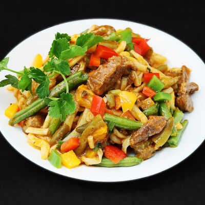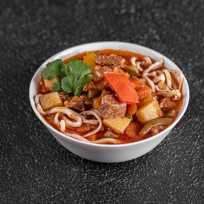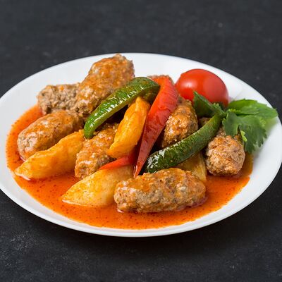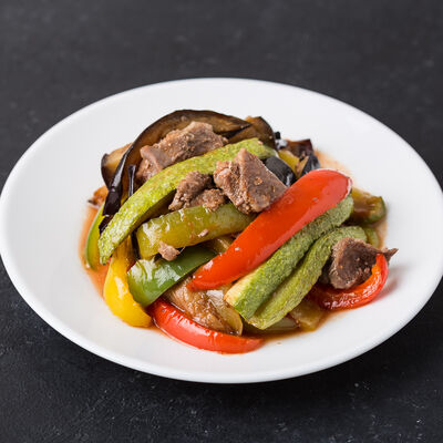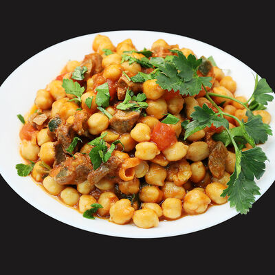 Горох нут, телятина, помидоры, лук, черный перец, томатный соус, петрушка