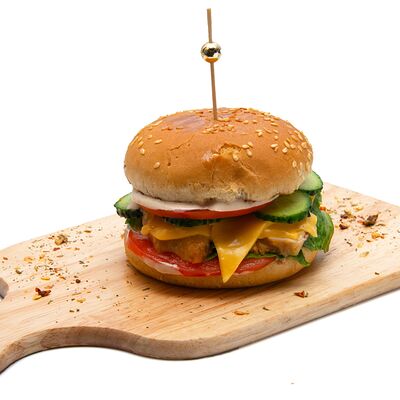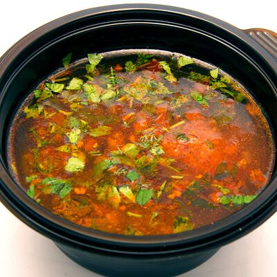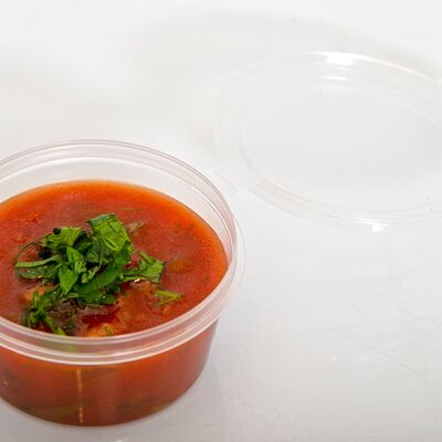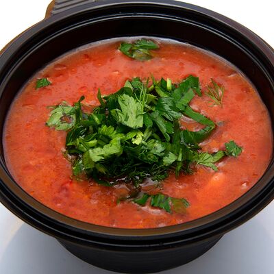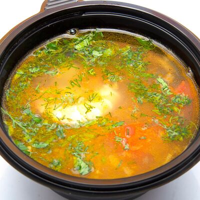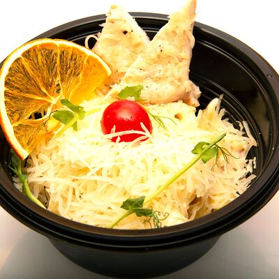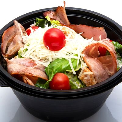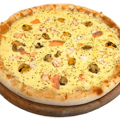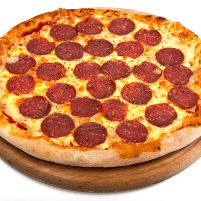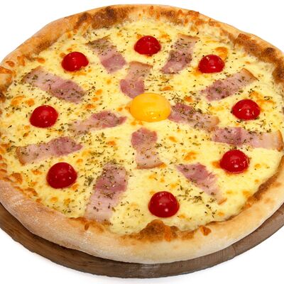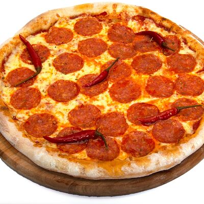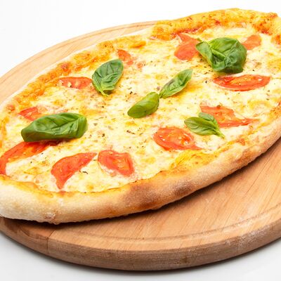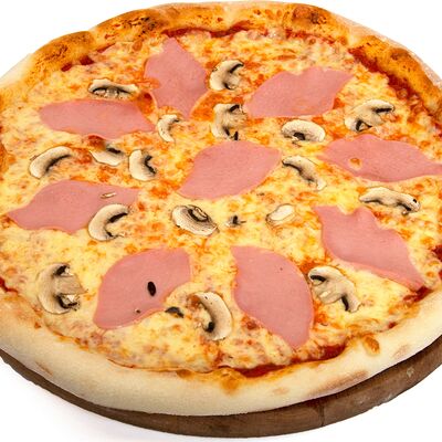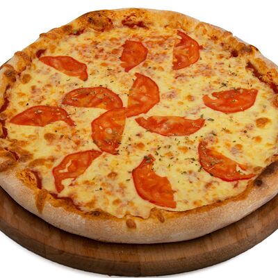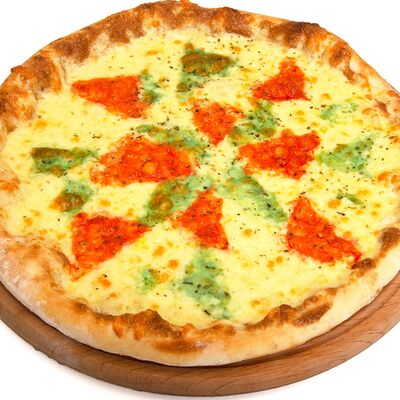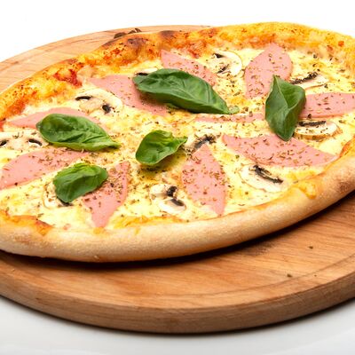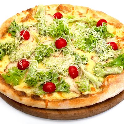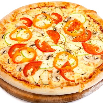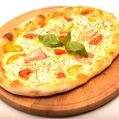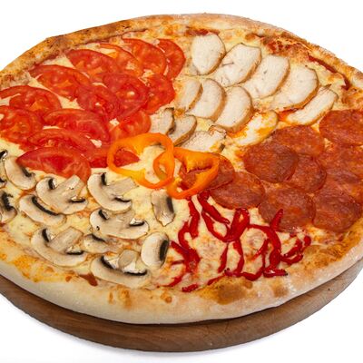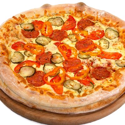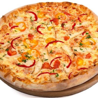 Тесто (мука, вода, соль, масло растительное, сахар), томат, колбаса, шампиньоны, помидор, сыр пармезан, перец болгарский, курица (30 см)