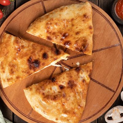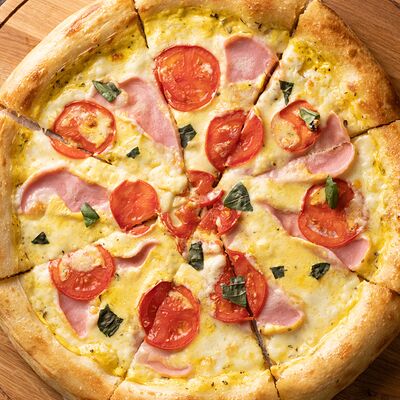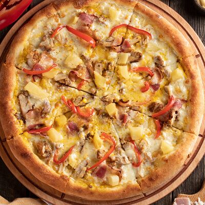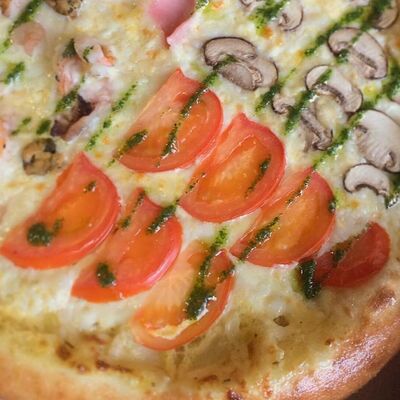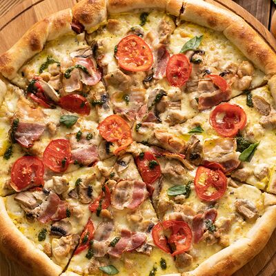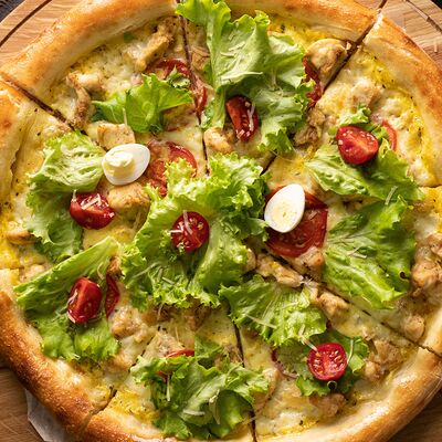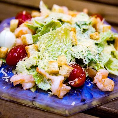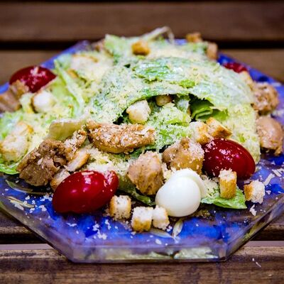 Жареная курочка, лист салата, томаты с соусом цезарь. Подается с гренками, перепелиным яйцом и ароматным пармезаном