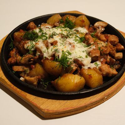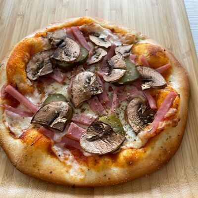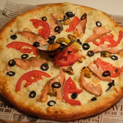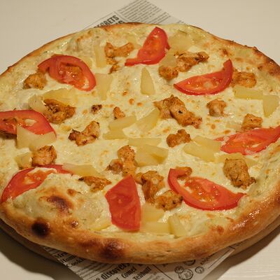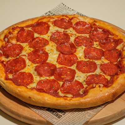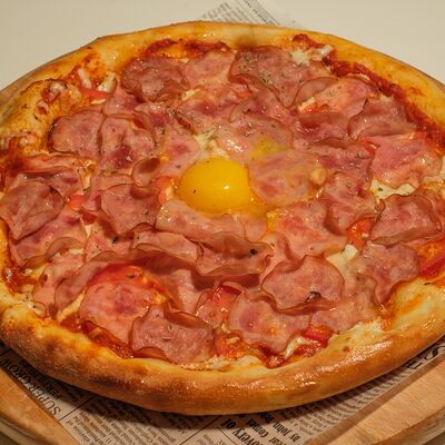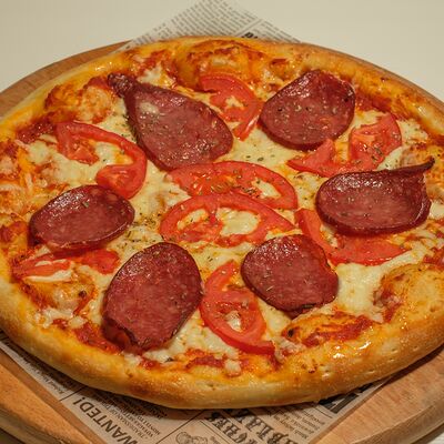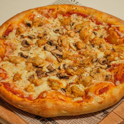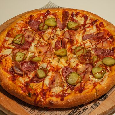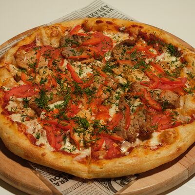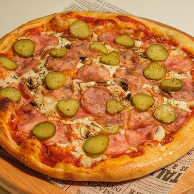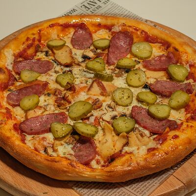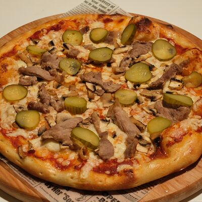 Томатный соус, сыр Моцарелла, тонко нарезанная маринованная говядина, маринованные огурчики, шампиньоны. Диаметр 30 см