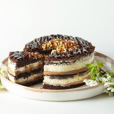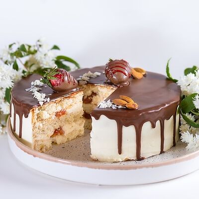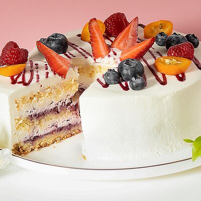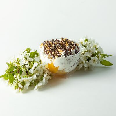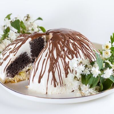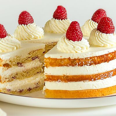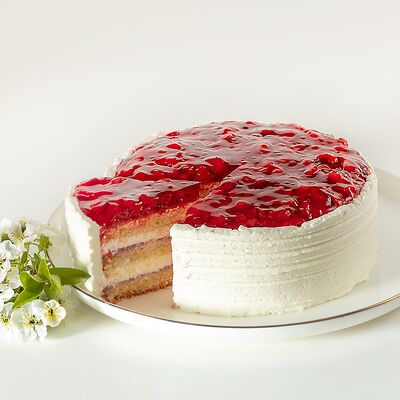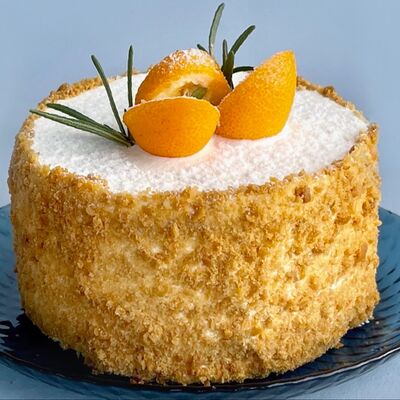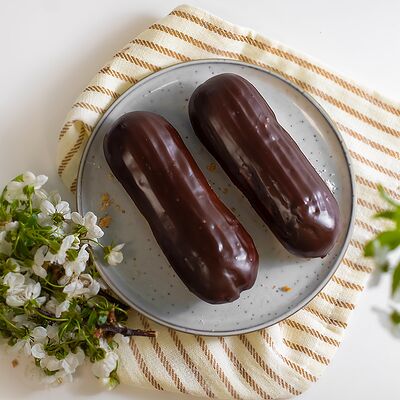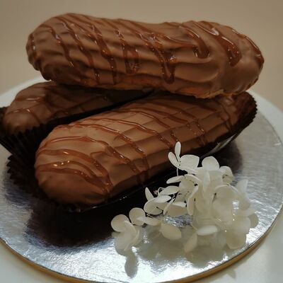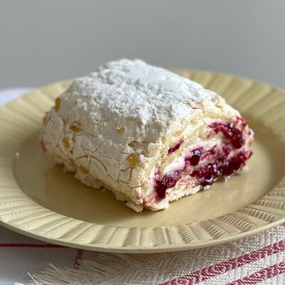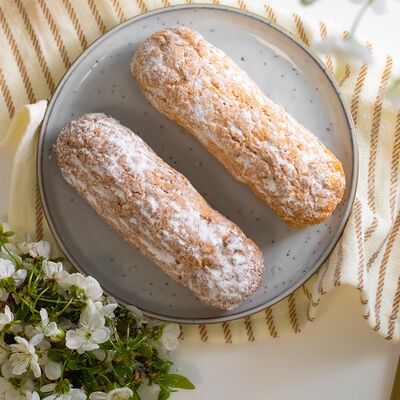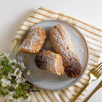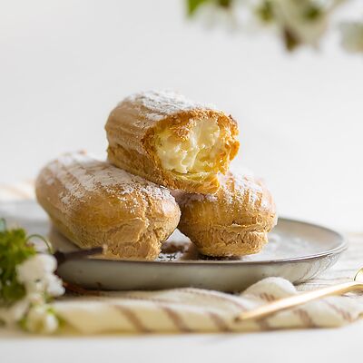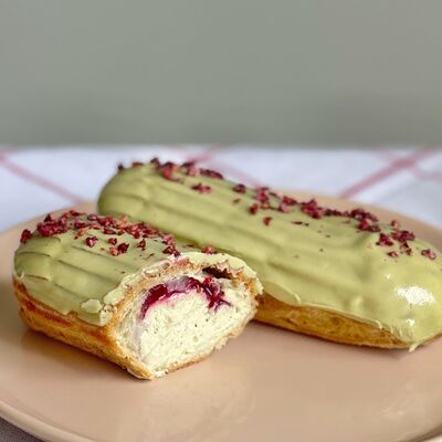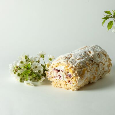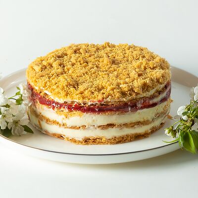 Заварное тесто с хрустящей сахарно-песочной верхушкой, клубничный крем, натуральные сливки, сыра Маскарпоне
