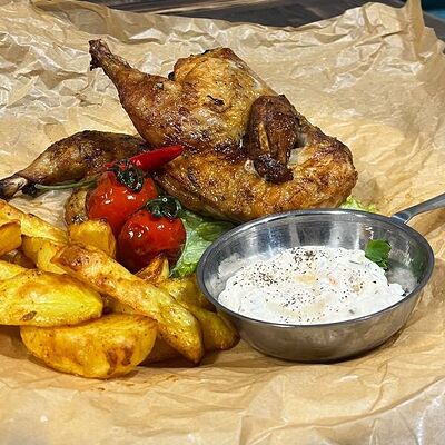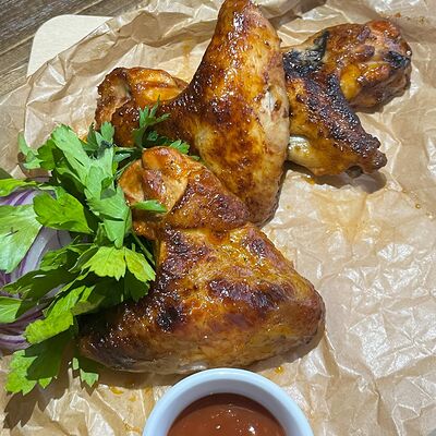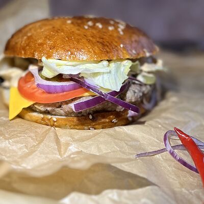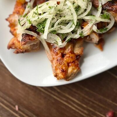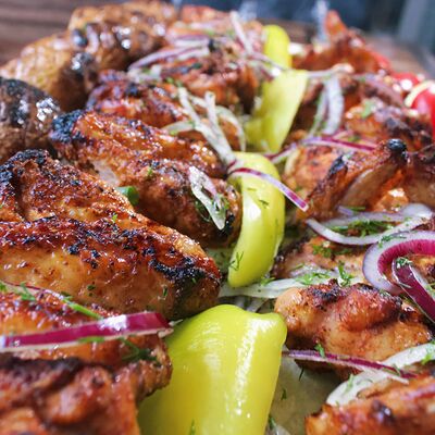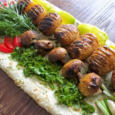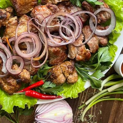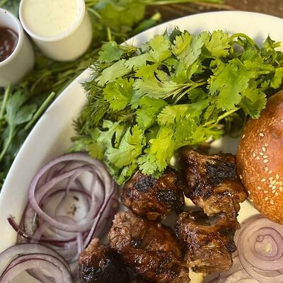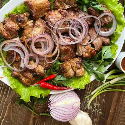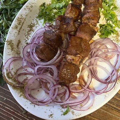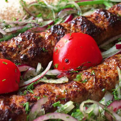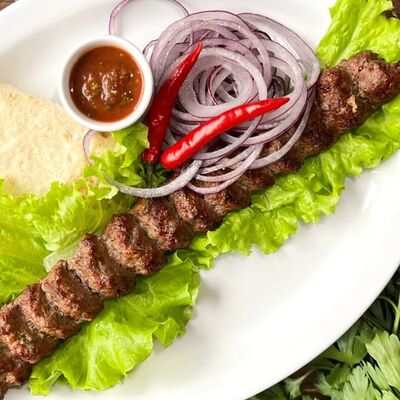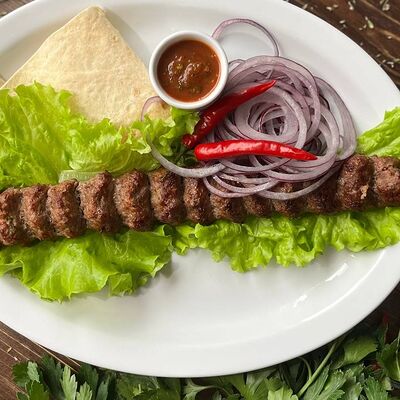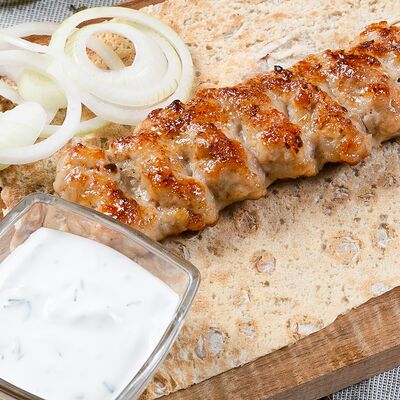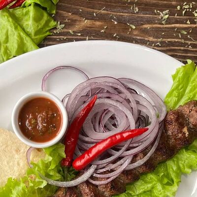 Люля из баранины (1 шт.; 150 г), подается вместе с соусом (50 г), луком (20 г), лавашом (30 г)