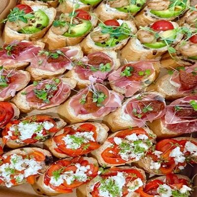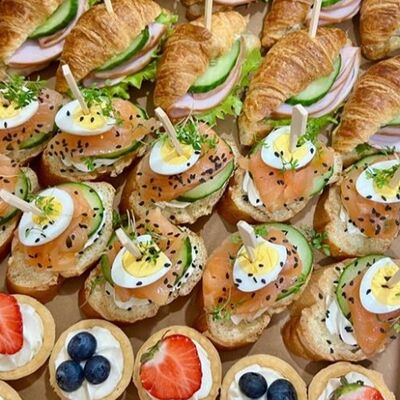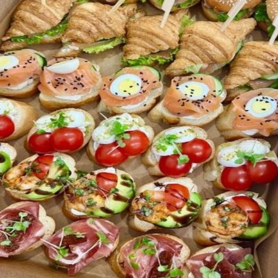 Брускетта с лососем (15 шт.), тарталетка с креветкой (12 шт.), тарталетка с красной икрой (12 шт.) (39 шт.)