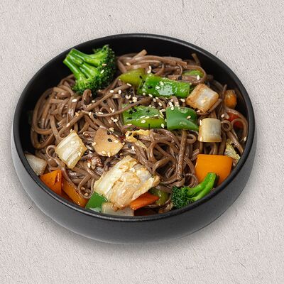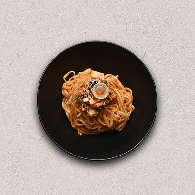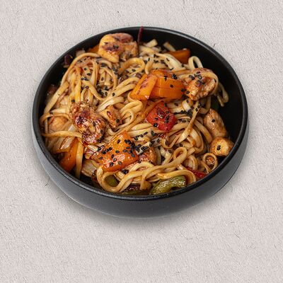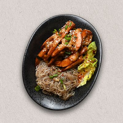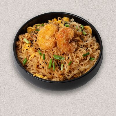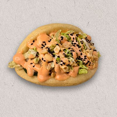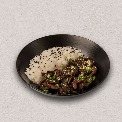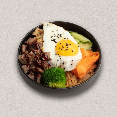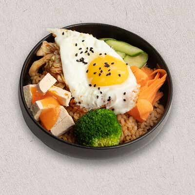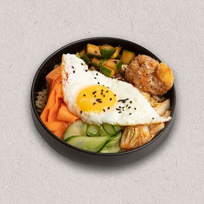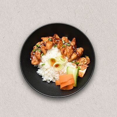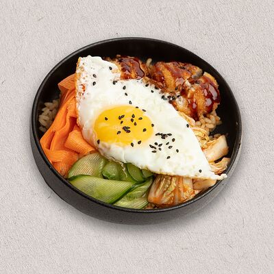 Хрустящая курица, рис, маринованные огурцы, маринованная морковь, салат кимчи, яйца, соус тереяки