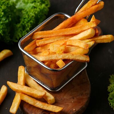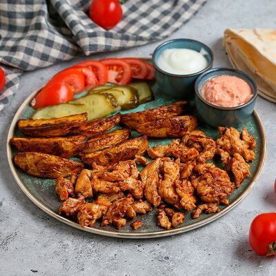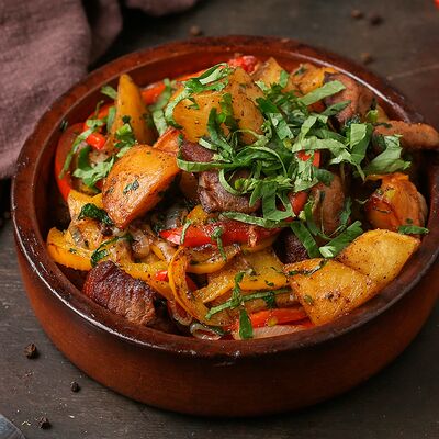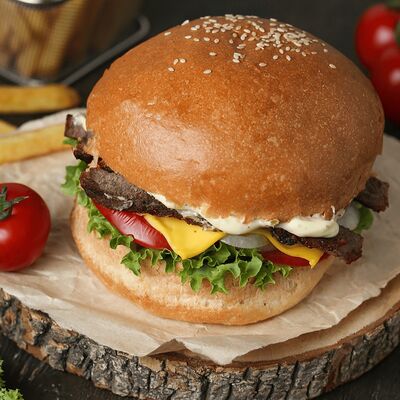 Говяжья вырезка, сладкий молотый перец, масло, маринованные огурцы, картофель фри, помидоры