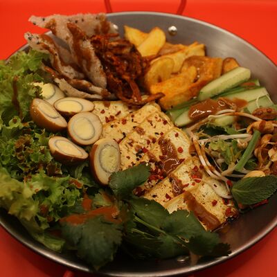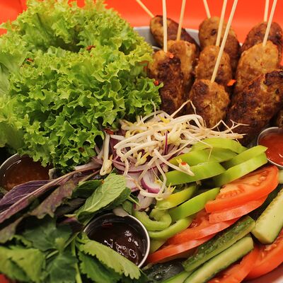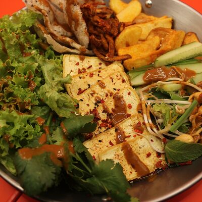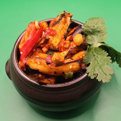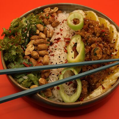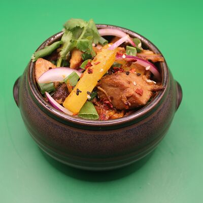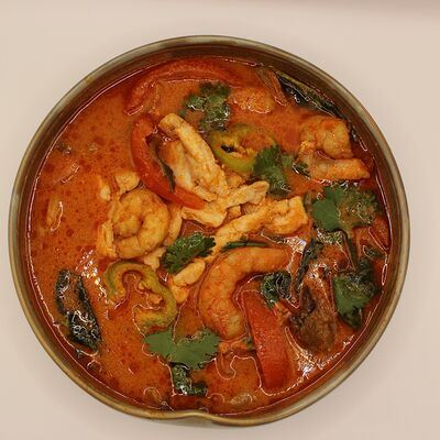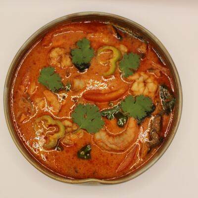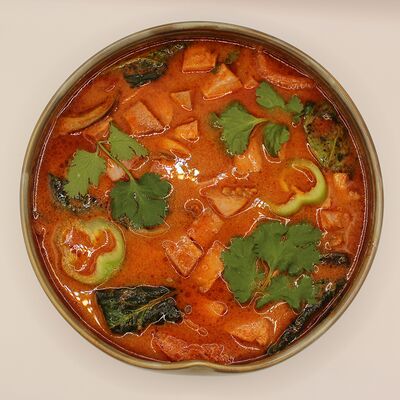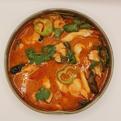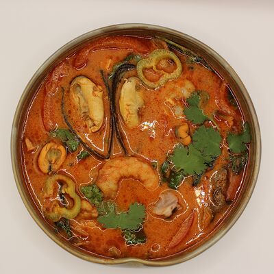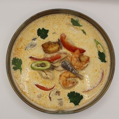 Свиная вырезка, паста Том Ям, лемонграсс, рыбный соус, соевый соус, куриный бульон, молоко, помидоры, вешенки, шпинат, кориандр, острый перец, подается с лаймом и кокосовым молоком