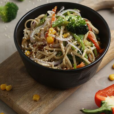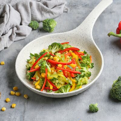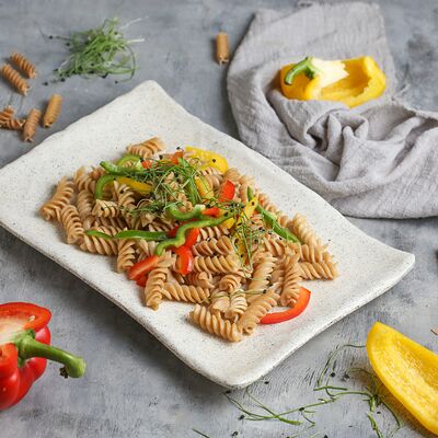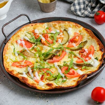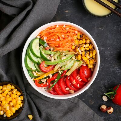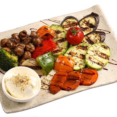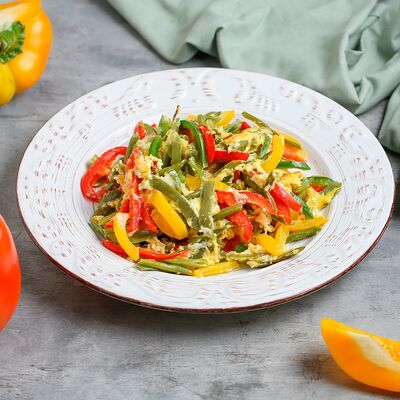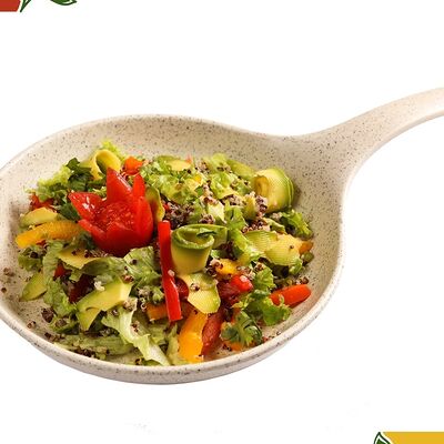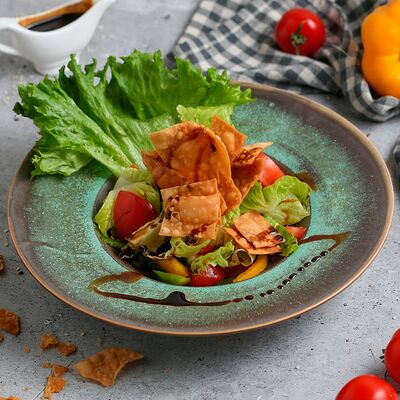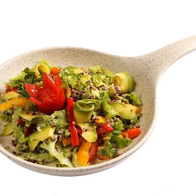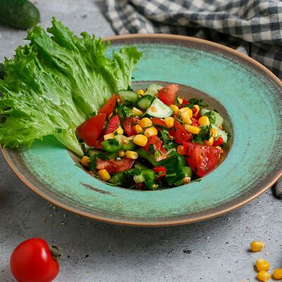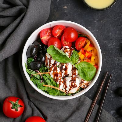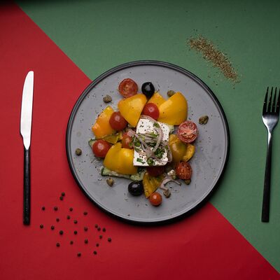 Цветной перец, помидоры черри, огурец, черные оливки, каперсы, фета, соус винигер, лук, орегано, уксус