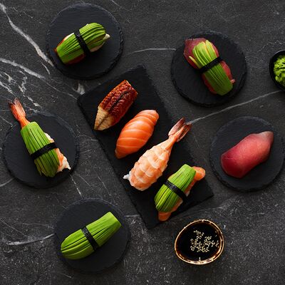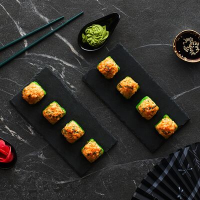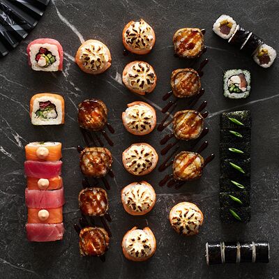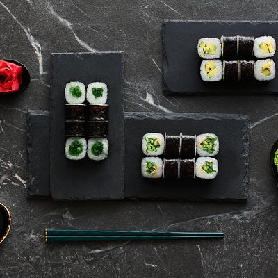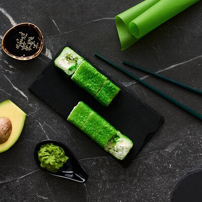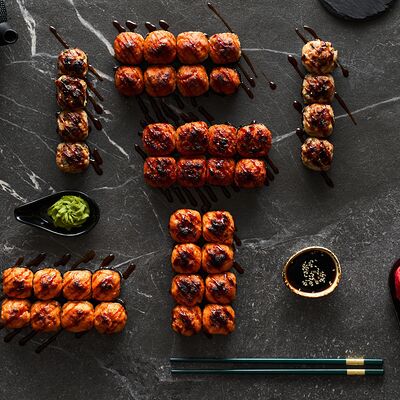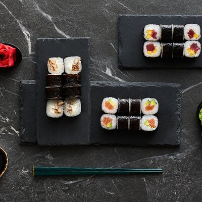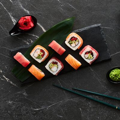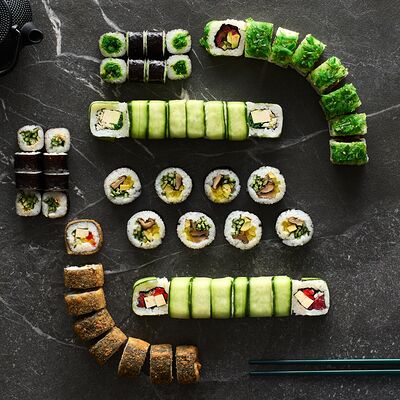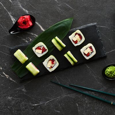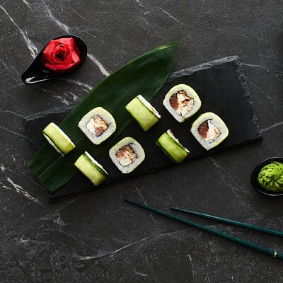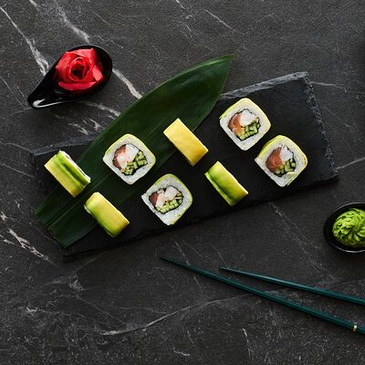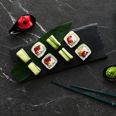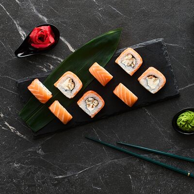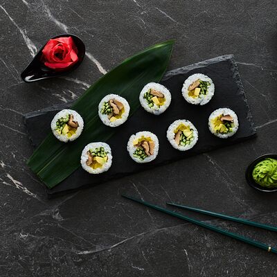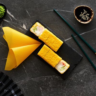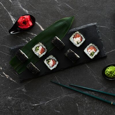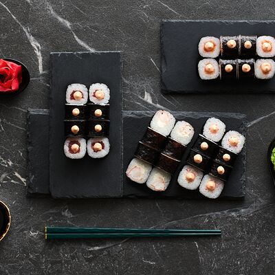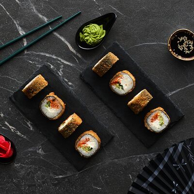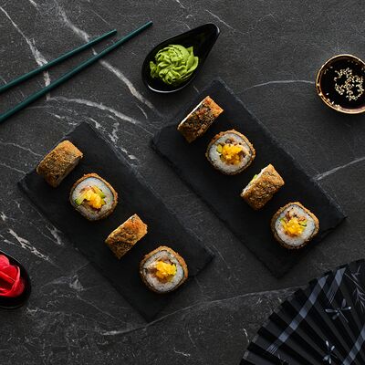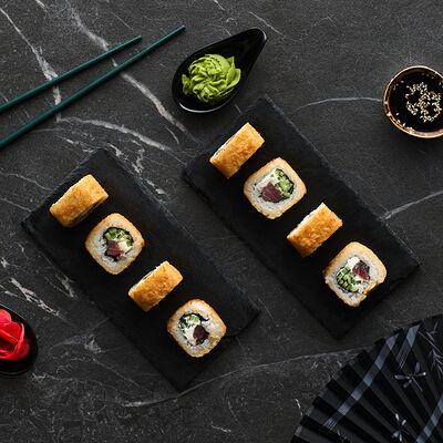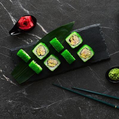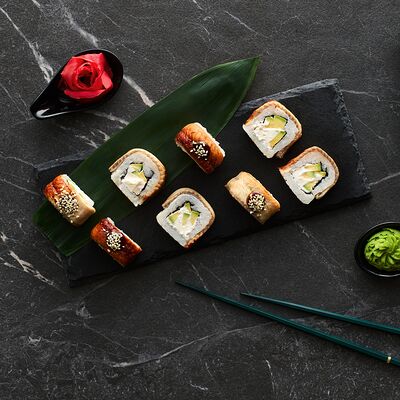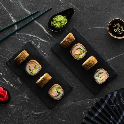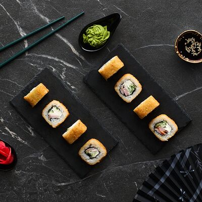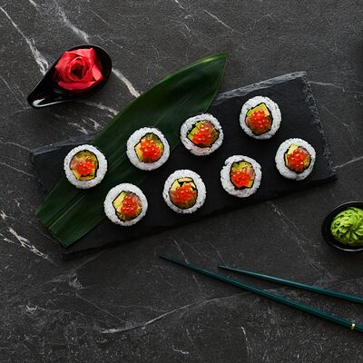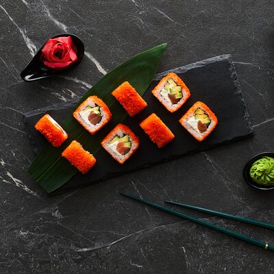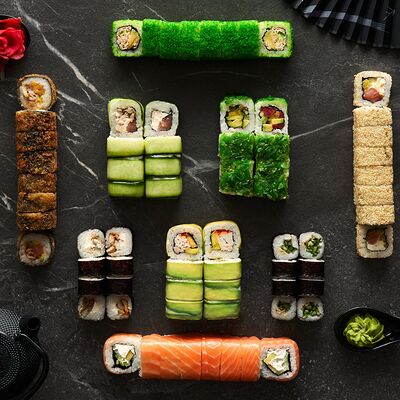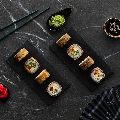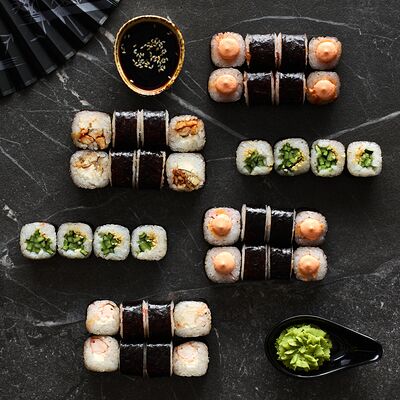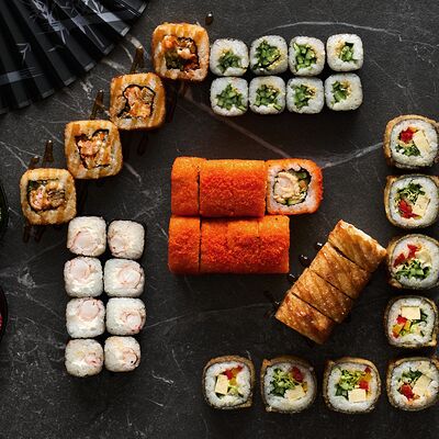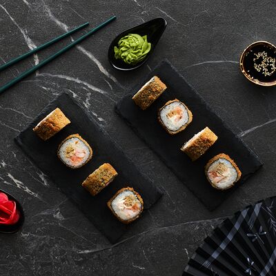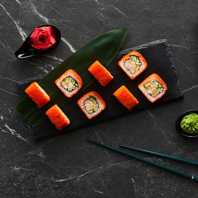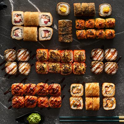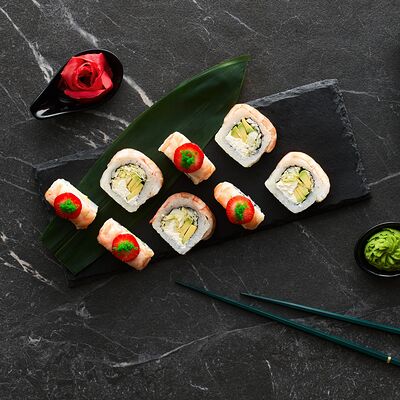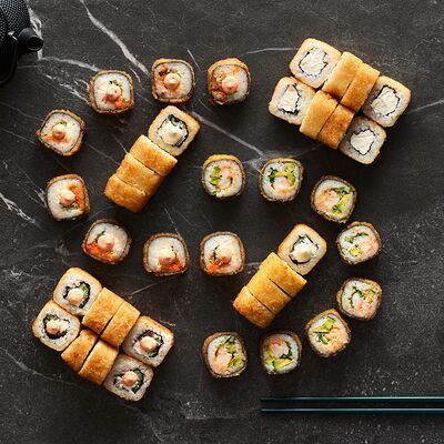 Хот тамаго сяке( 8 штук), хот веган (8 штук), Калифорния Эбби темпура (8 штук), Каппа маки (8 штук), Маки чиз Эби (8 штук), всего: (40 штук)