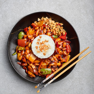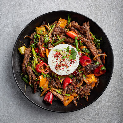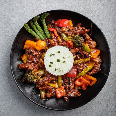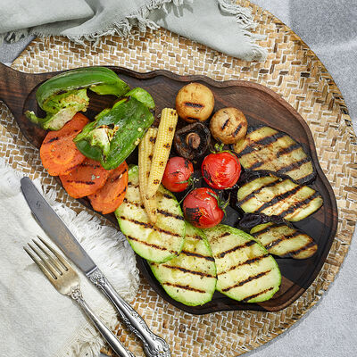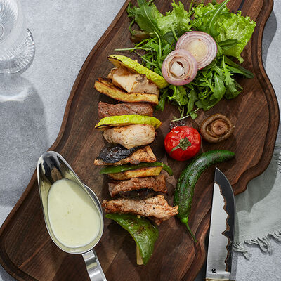 Телячья вырезка, вырезка индейки, куриная грудка, кабачок, баклажан, картофель, болгарский перец, лук