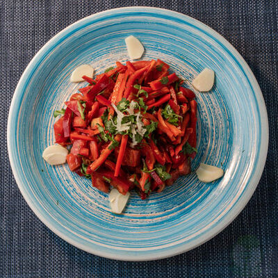 Баклажаны, чеснок, тмин, кариандр, тахини, оливковое масло холодного отжима, соль