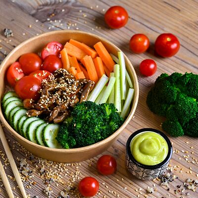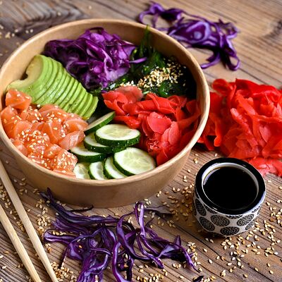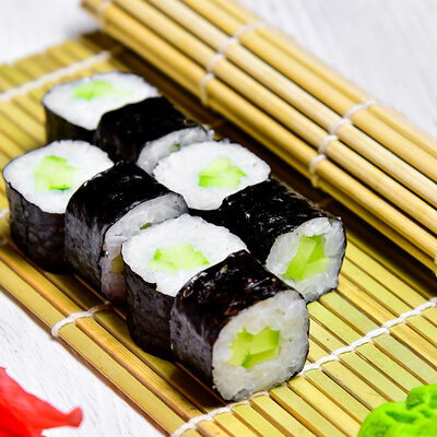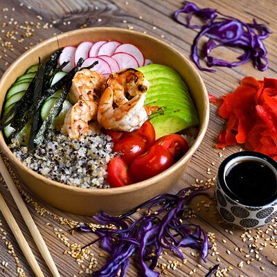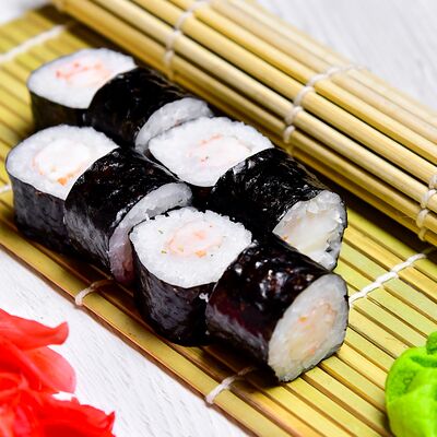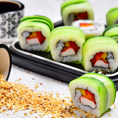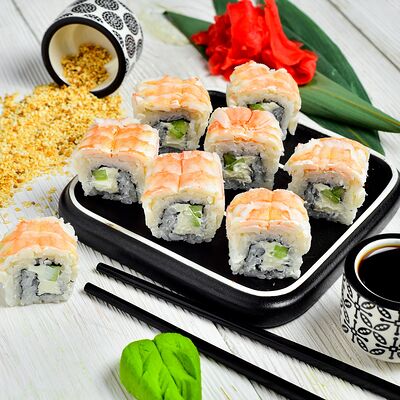 Рис, креветки, огурцы, соус палм, американский сыр