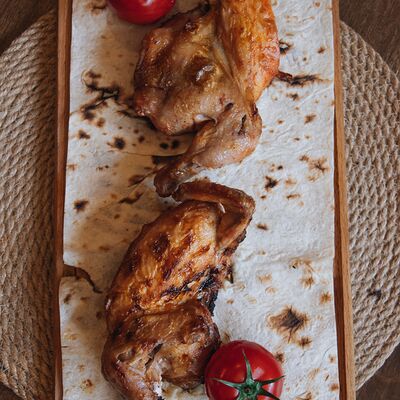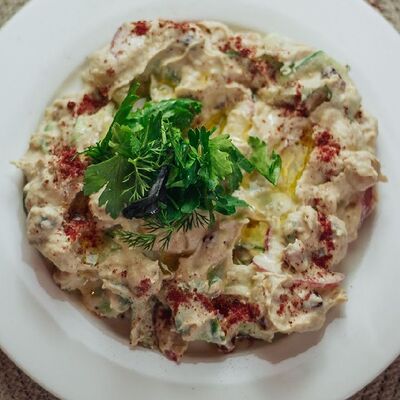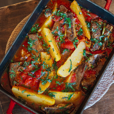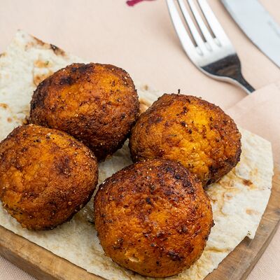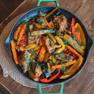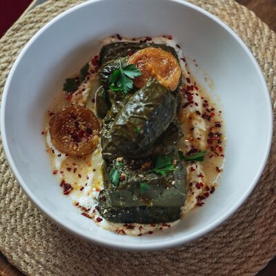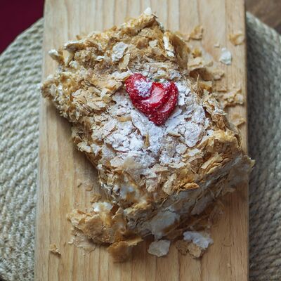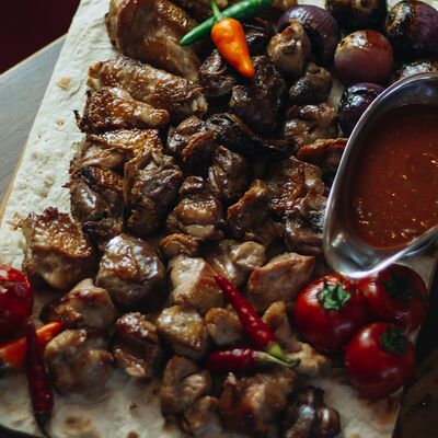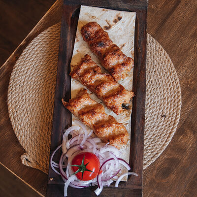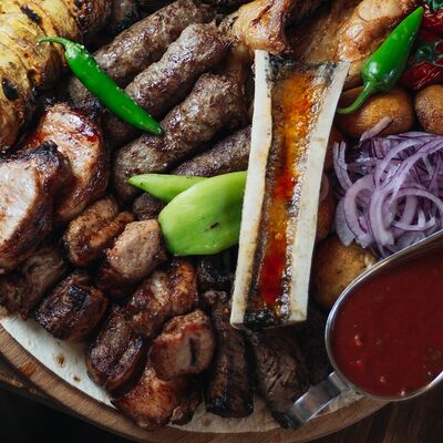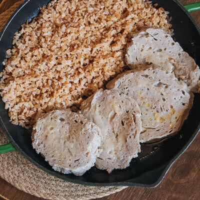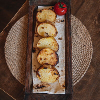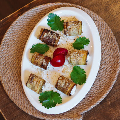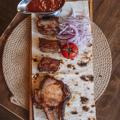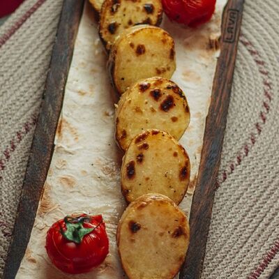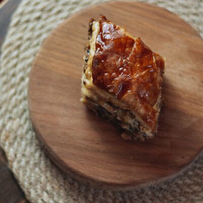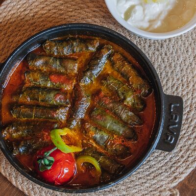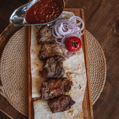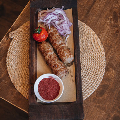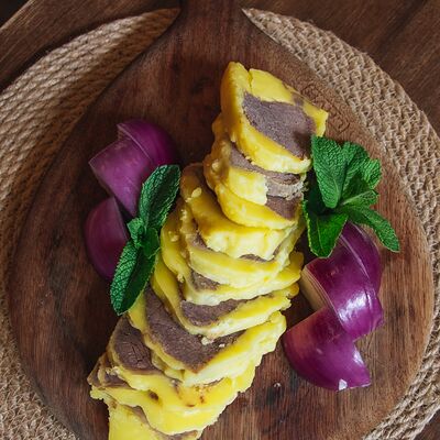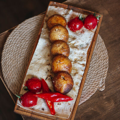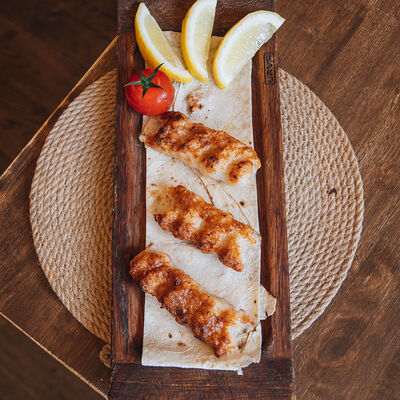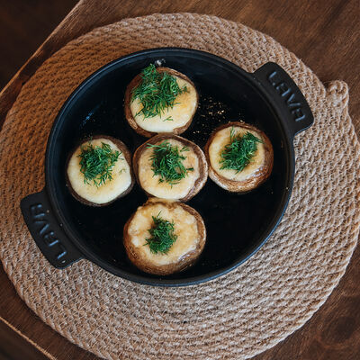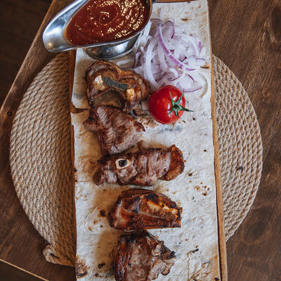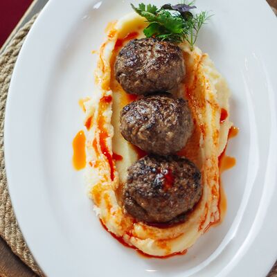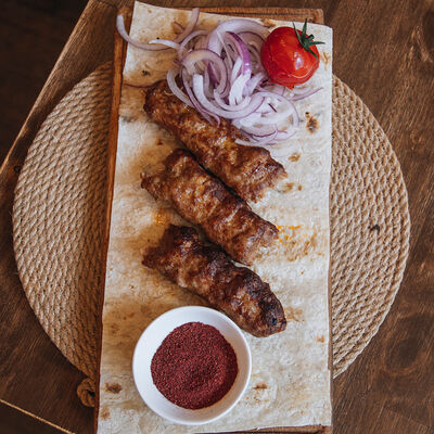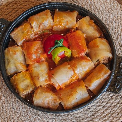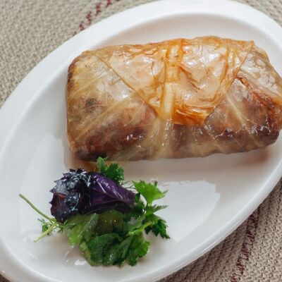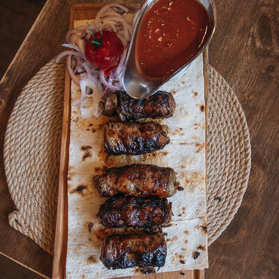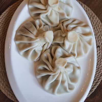 Тесто, фарш с говядиной, черный перец, чеснок, зелень, сметана, сливочное масло (в одной порции-3 шт.)