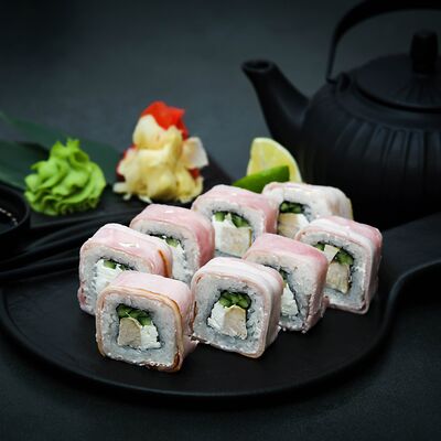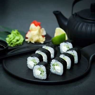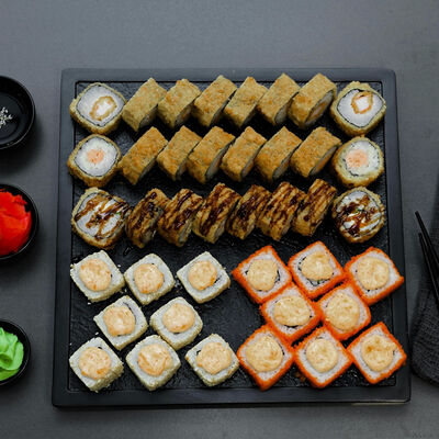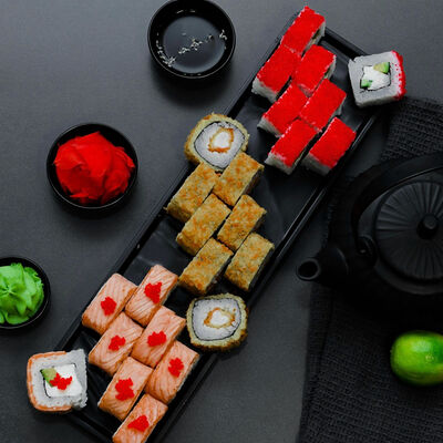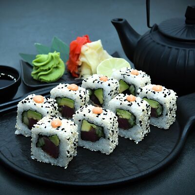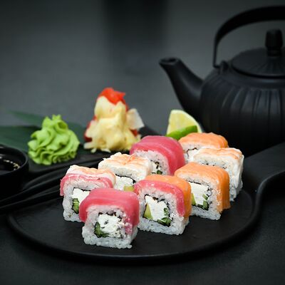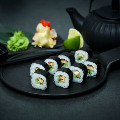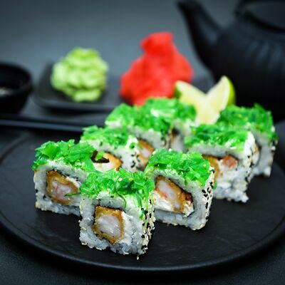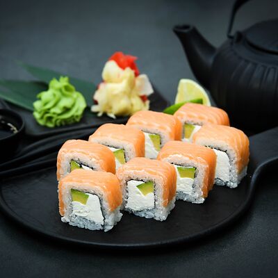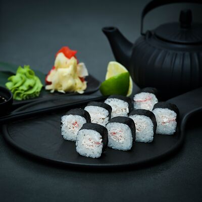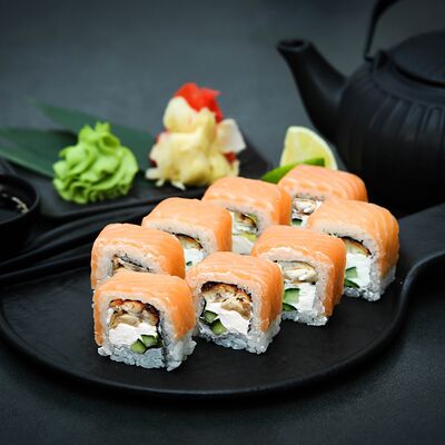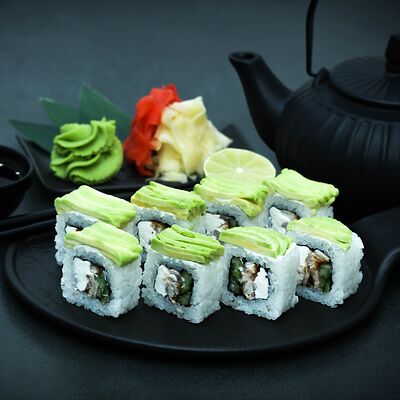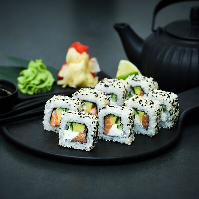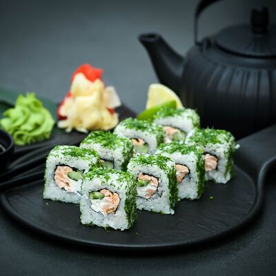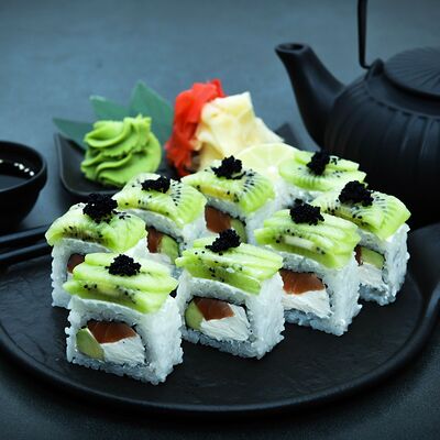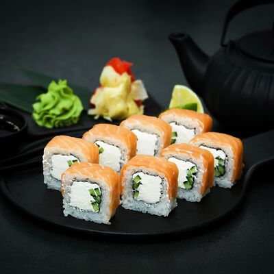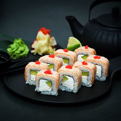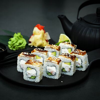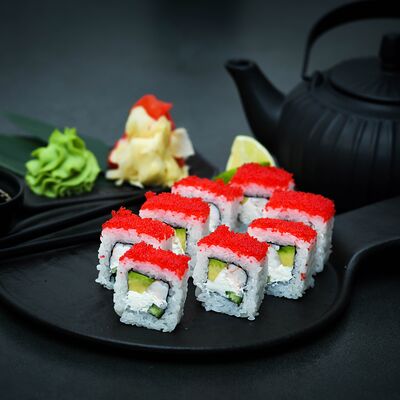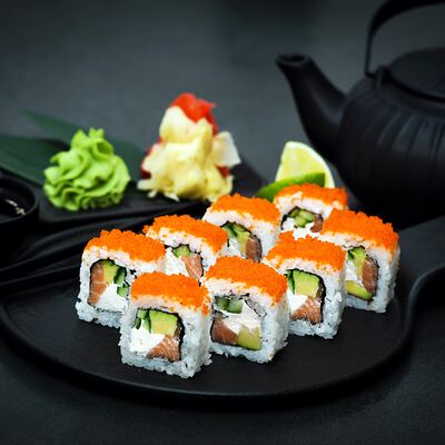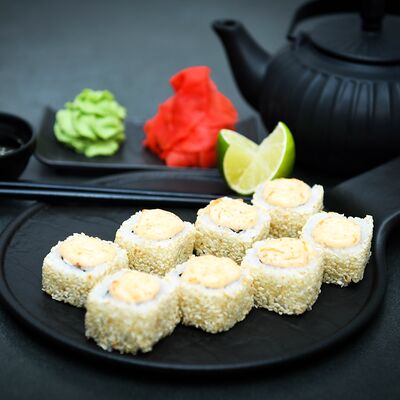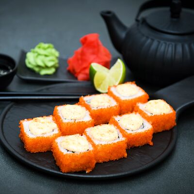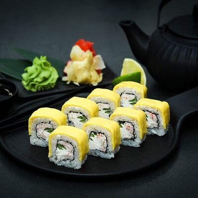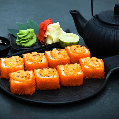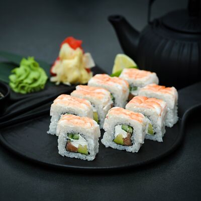 Нори, рис, сыр, авокадо, тобико, лосось, креветки, соус кимчи, майонез (8 штук)