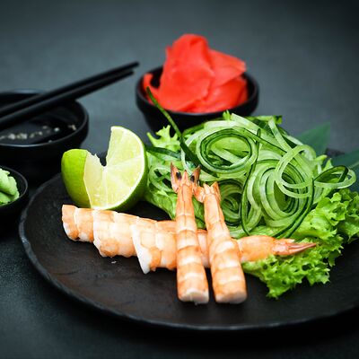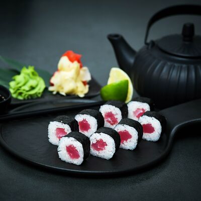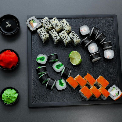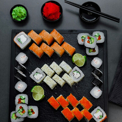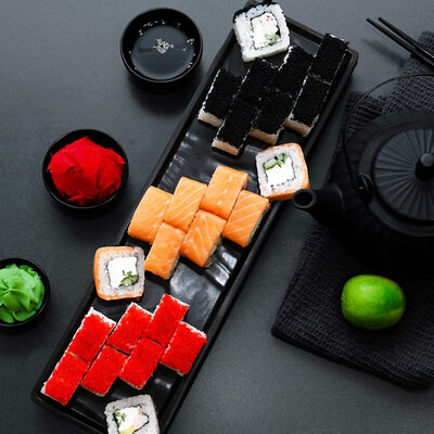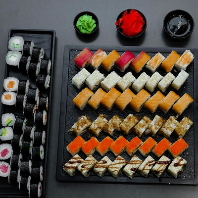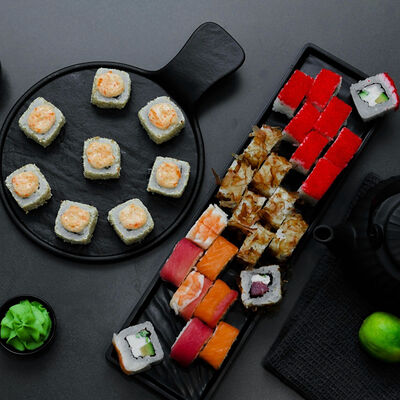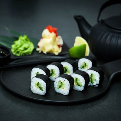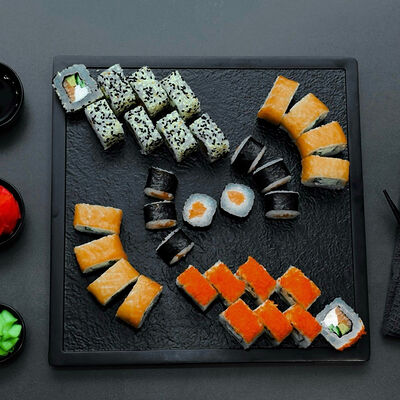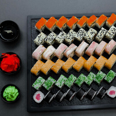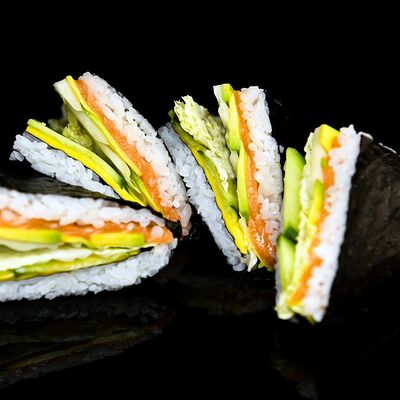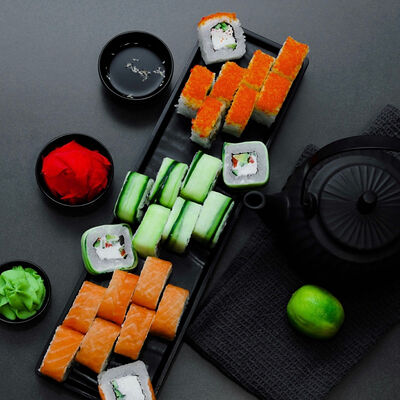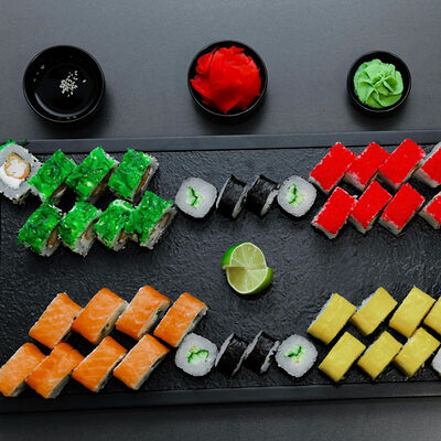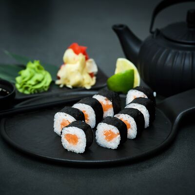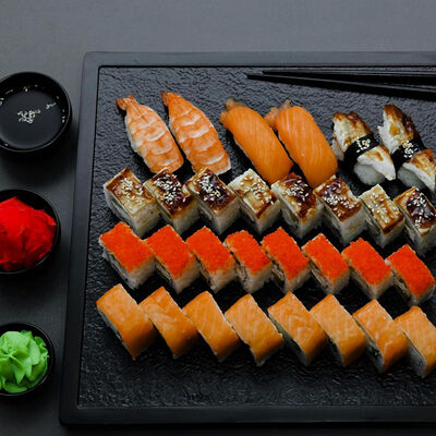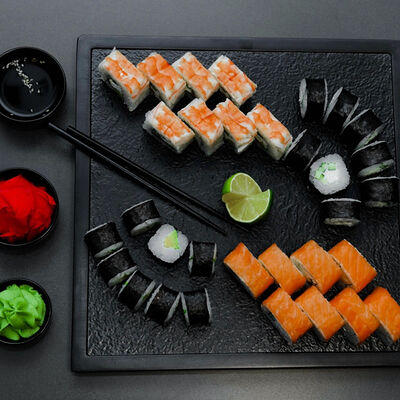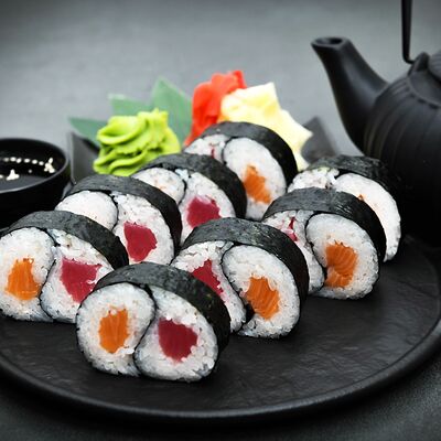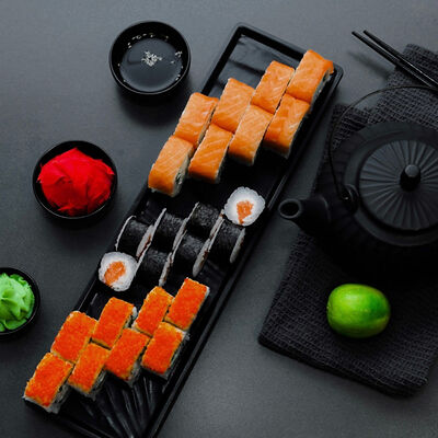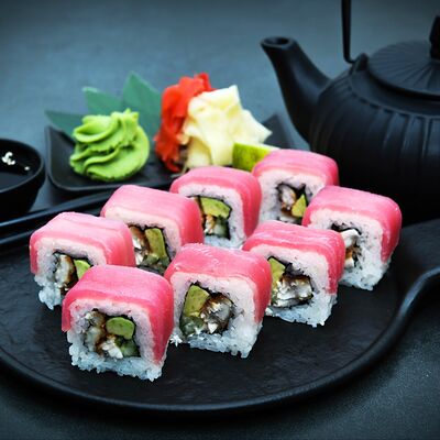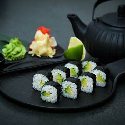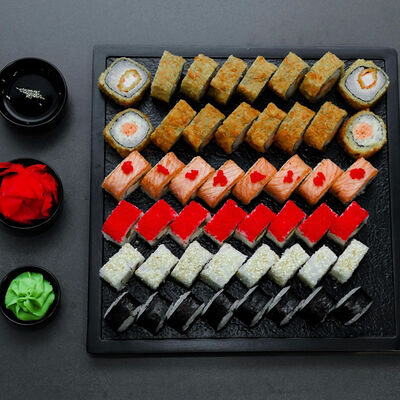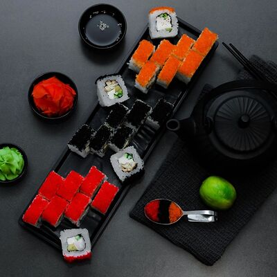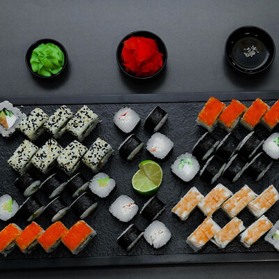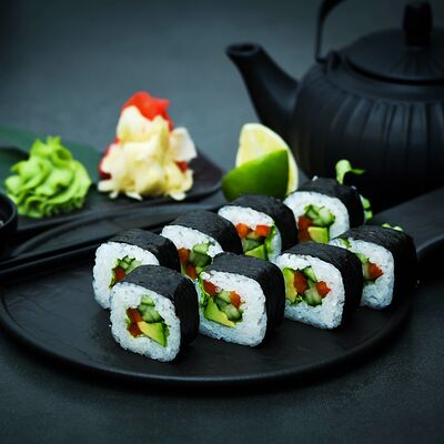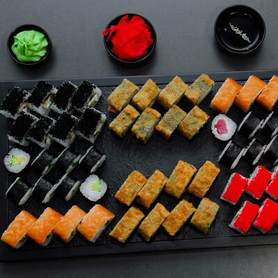 Нори, рис, сыр, авокадо, тобико, лосось, креветки, соус кимчи, майонез (8 штук)