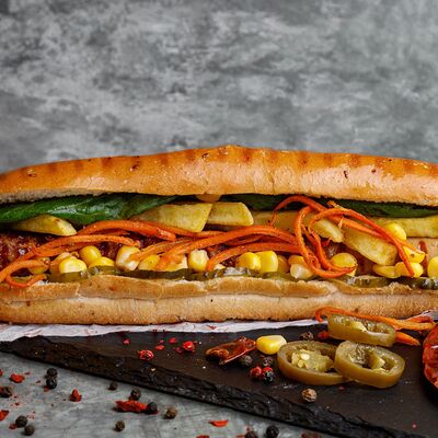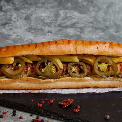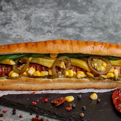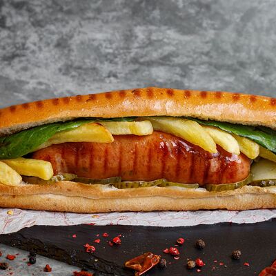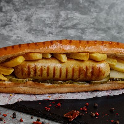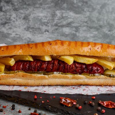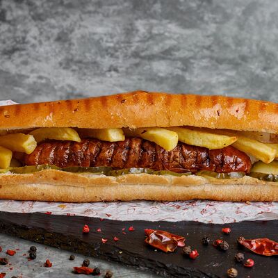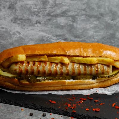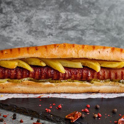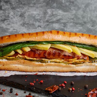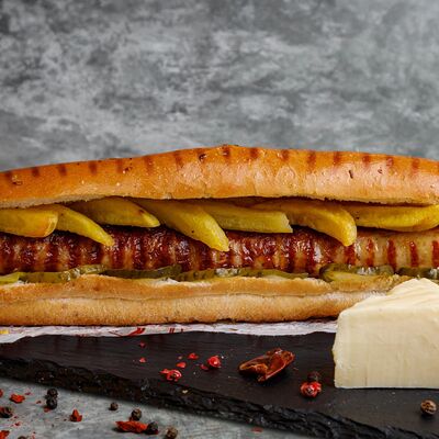 Хлеб, колбаса со свиным беконом, соус, соленые огурцы, картофель
