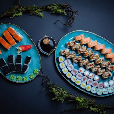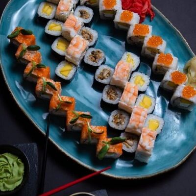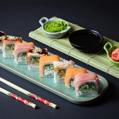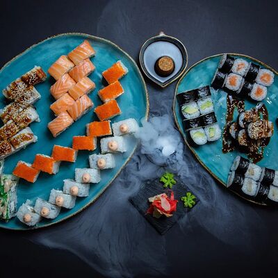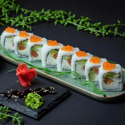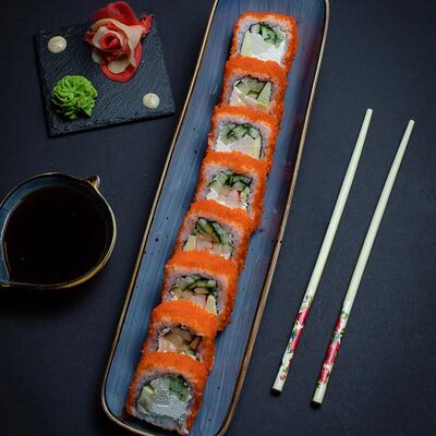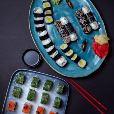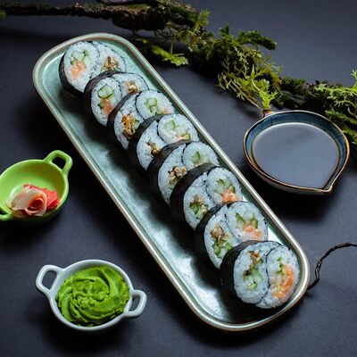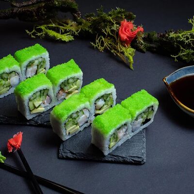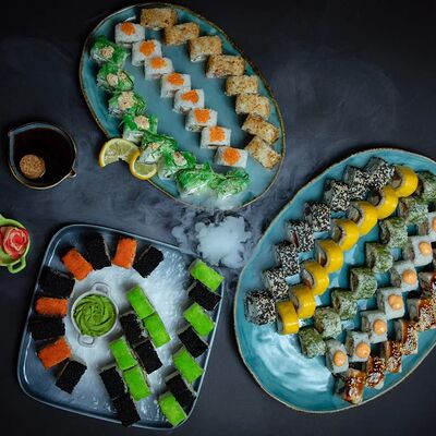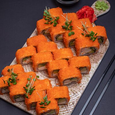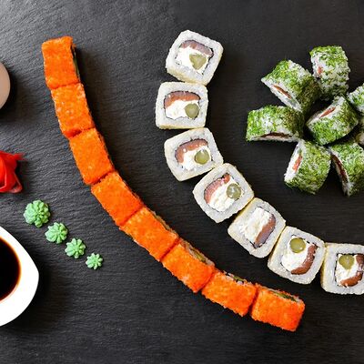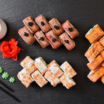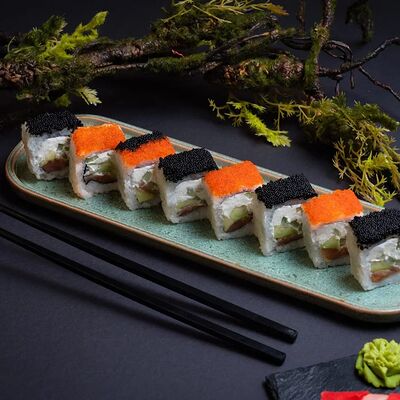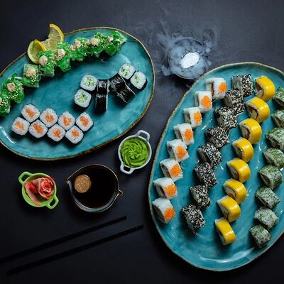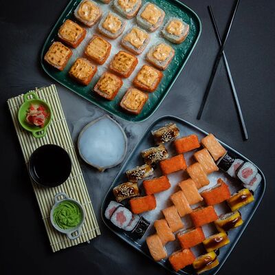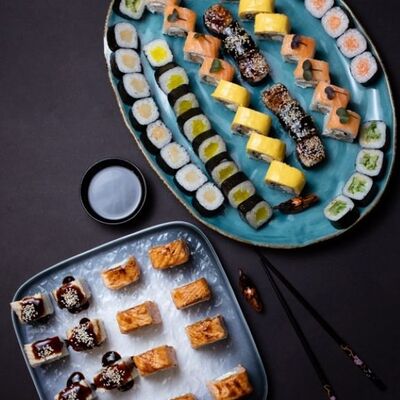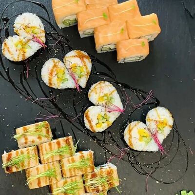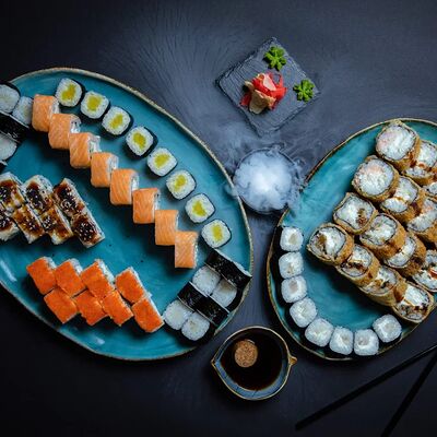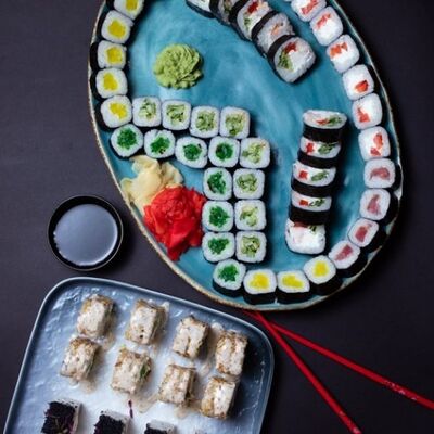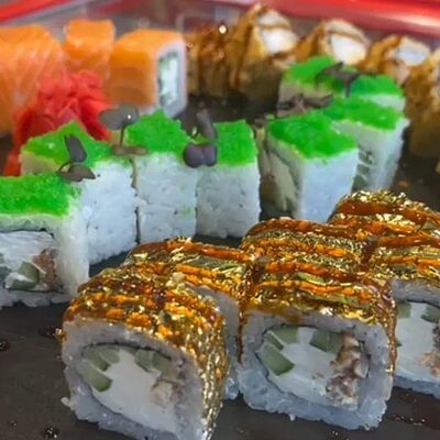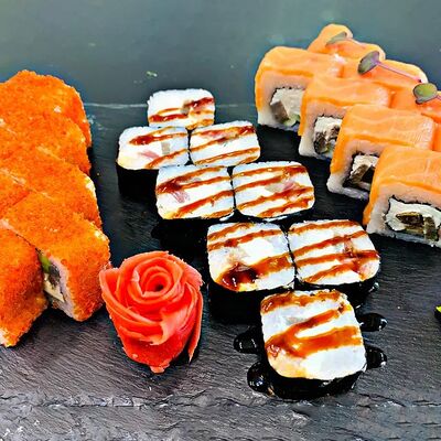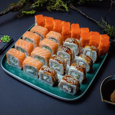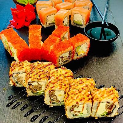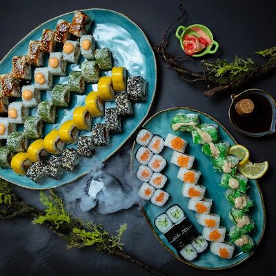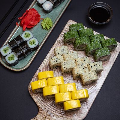 Калифорния: тобико, лосось, перец, авокадо, сыр, Черная скумбрия: хлопья сушеного тунца, Чука, перец, огурец, соус унаги, сыр, Маки футо Эби: креветки, болгарский перец, огурец, соус кимчи, Маки тека: тунец, Маки Капа: огурец, кунжут, Маки чиз Ронбун: сыр, болгарский перец, маки Чука: Чука, Такуан маки: японский маринованный редис (66 кусочков)