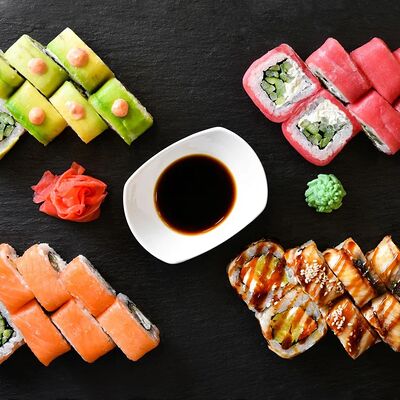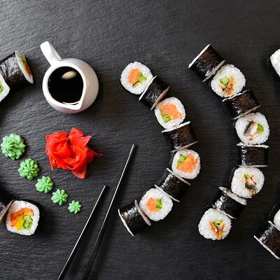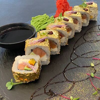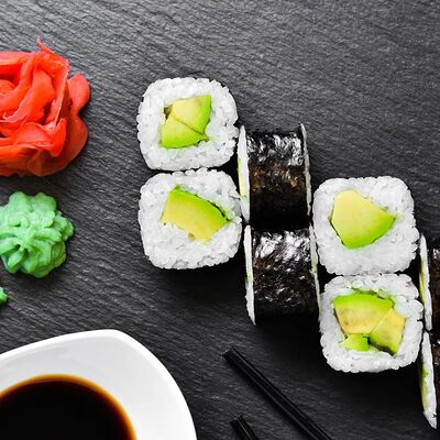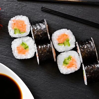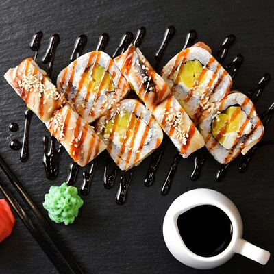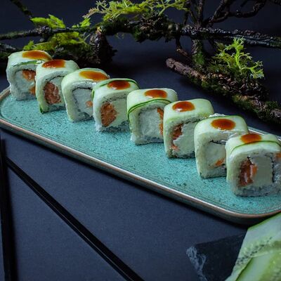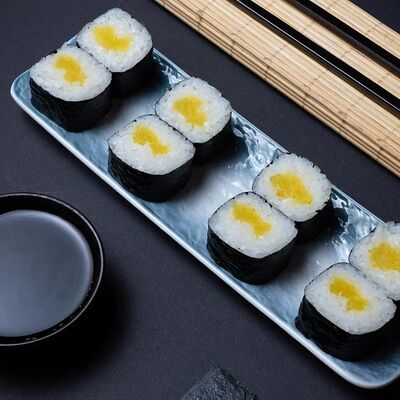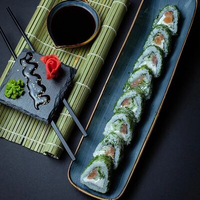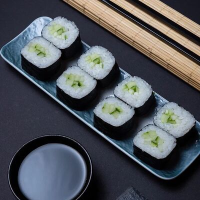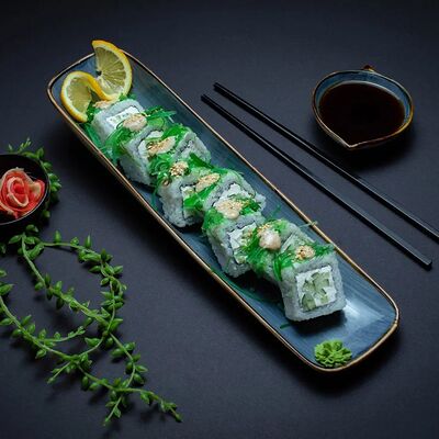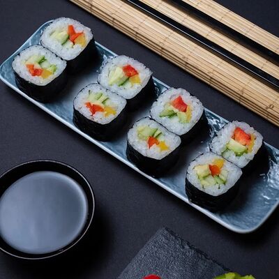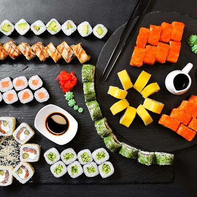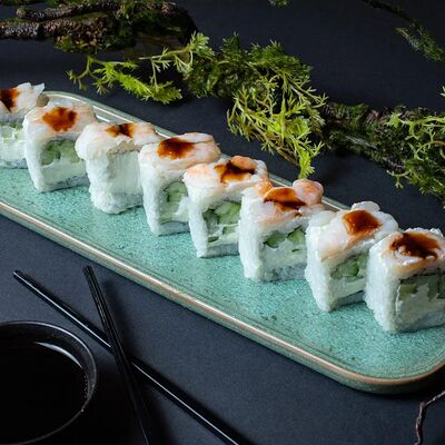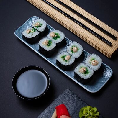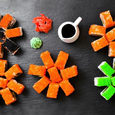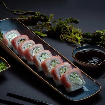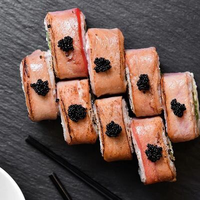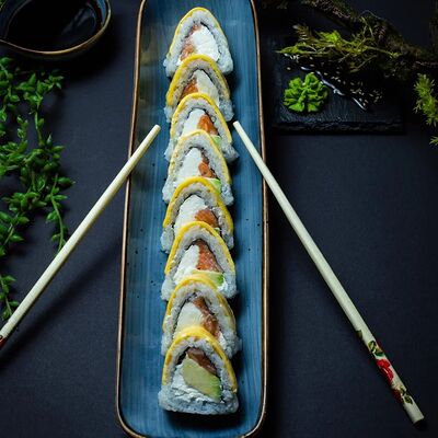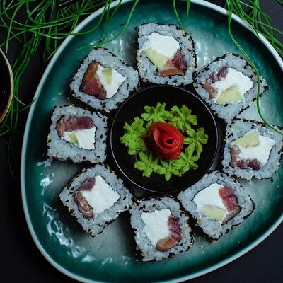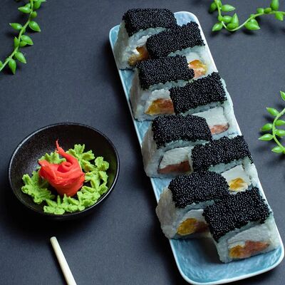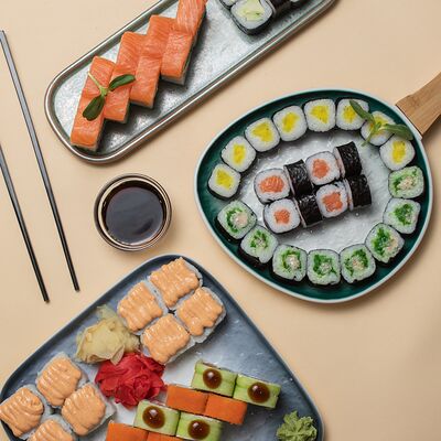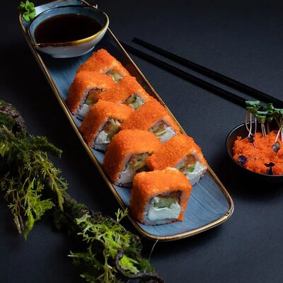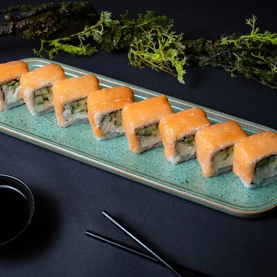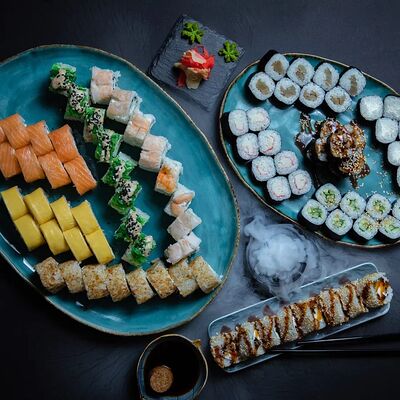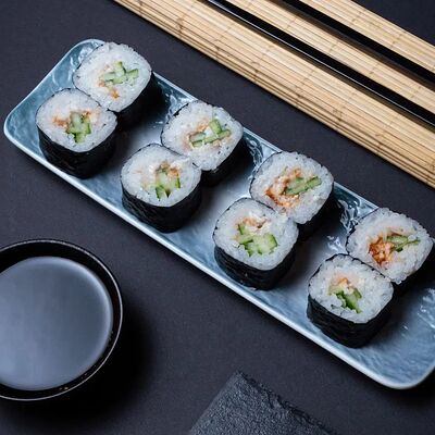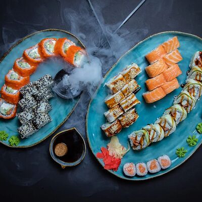 Калифорния: тобико, лосось, перец, авокадо, сыр, Черная скумбрия: хлопья сушеного тунца, Чука, перец, огурец, соус унаги, сыр, Маки футо Эби: креветки, болгарский перец, огурец, соус кимчи, Маки тека: тунец, Маки Капа: огурец, кунжут, Маки чиз Ронбун: сыр, болгарский перец, маки Чука: Чука, Такуан маки: японский маринованный редис (66 кусочков)