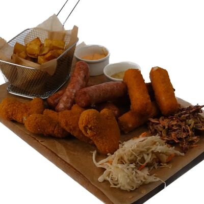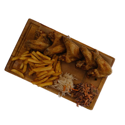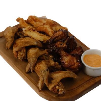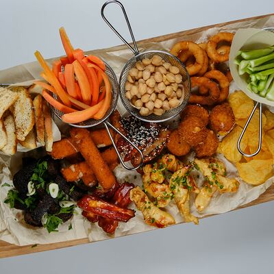 Жареные сырные палочки, жареные сырные шарики, чипсы, сухарики с приправами, гренки, крылышки Буффало, куриные крылышки с соусом террейяки, куриные палочки, ребрышки, маринованная морковь, огурец, сельдерей, нут